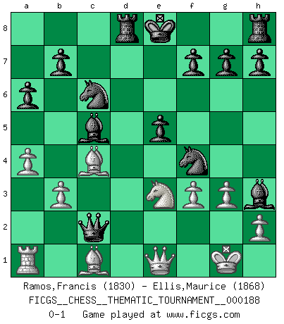Last move : 0-1 2015 January 24 6:38:53 [Event "FICGS__CHESS__THEMATIC_TOURNAMENT__000188"] [Site "FICGS"] [Date "2015.01.18"] [Round "1"] [White "Ramos,Francis"] [Black "Ellis,Maurice"] [Result "0-1"] [WhiteElo "1830"] [BlackElo "1868"] 1.Nf3 d5 2.b3 c5 3.e4 dxe4 4.Ng5 a6 5.Bc4 e6 6.O-O Qxg5 7.d4 Qg6 8.Re1 cxd4 9.Nd2 Nf6 10.a4 Nc6 11.Bb2 e5 12.Qe2 Bh3 13.f3 e3 14.Nf1 Nh5 15.g3 Nf4 16.Qd1 Bb4 17.Rxe3 dxe3 18.Nxe3 Bc5 19.Bc1 Rd8 20.Qe1 Qxc2 0-1 Reti : Nimzovich-Larsen attack Kingside Castling by player White (move 6) Player Black won this chess game. Follow this game move after move (download)The mistakes are there, waiting to be made. (Savielly Tartakower) Wenn du nicht weißt was du tun sollst, warte bis dein Gegner eine Idee hat. Sie wird sicher schlecht sein. (Siegbert Tarrasch) Los Peones son nacidos libres, y aún así, se encuentran por doquier encadenados. (Rick Kennedy) J'ai toujours senti une vague pitié pour l'homme qui ne connaît rien aux échecs, tout comme j'en aurais pour un homme ignorant de l'amour. Les Echecs, comme la musique ou comme l'amour, ont le pouvoir de rendre heureux. (Siegbert Tarrasch) A shortcut is the longest distance between two points. (Don Groves)