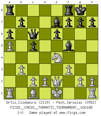 Last move : 1-0 2015 May 19 15:25:24 [Event "FICGS__CHESS__THEMATIC_TOURNAMENT__000188"] [Site "FICGS"] [Date "2015.01.18"] [Round "1"] [White "Ortiz,Clodomiro"] [Black "Pech,Jaroslav"] [Result "1-0"] [WhiteElo "2119"] [BlackElo "0952"] 1.Nf3 d5 2.b3 c5 3.e4 dxe4 4.Ng5 Nf6 5.Nc3 Bf5 6.Bb5+ Nc6 7.Qe2 Qb6 8.Ba4 e6 9.Ngxe4 Nxe4 10.Nxe4 Be7 11.Bxc6+ Qxc6 12.f3 O-O 13.a4 a6 14.a5 1-0 This chess game has been lost on time (started : 2015.01.18 15:12:44) Reti : Nimzovich-Larsen attack Kingside Castling by player Black (move 12) Player White won this chess game. Follow this game move after move (download)Chess is a sea in which a gnat may drink and an elephant may bathe. (Hindu proverb) Ich weiss nicht was Gott gegen mich auf 1.e4 antworten würde. (Robert James Fischer) El muchacho (en ese entonces un niño de 12 años llamado Anatoly Karpov) no tiene ni idea de lo que es el Ajedrez y no hay futuro en absoluto para el en esta profesión. (Mikhail Botvinnik) Il (Jacob Murray) ne joue pas pour le bon coup, mais pour le meilleur. (Eloi Relange) Men never do evil so completely and cheerfully as when they do it from religious conviction. (Blaise Pascal)
