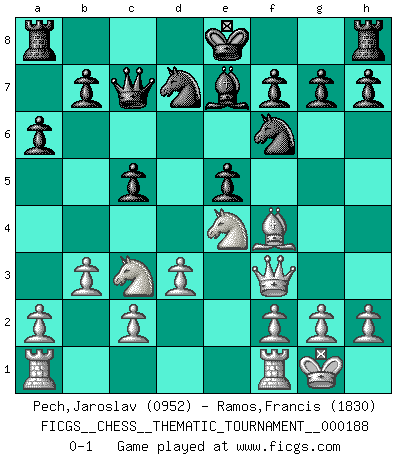 Last move : 0-1 2015 May 21 22:45:29 [Event "FICGS__CHESS__THEMATIC_TOURNAMENT__000188"] [Site "FICGS"] [Date "2015.01.18"] [Round "1"] [White "Pech,Jaroslav"] [Black "Ramos,Francis"] [Result "0-1"] [WhiteElo "0952"] [BlackElo "1830"] 1.Nf3 d5 2.b3 c5 3.e4 dxe4 4.Ng5 Bf5 5.Nc3 Nf6 6.Bb5+ Bd7 7.Bxd7+ Nbxd7 8.Ngxe4 e6 9.O-O a6 10.Qf3 Qc7 11.d3 Be7 12.Bf4 e5 0-1 This chess game has been lost on time (started : 2015.01.18 15:12:44) Reti : Nimzovich-Larsen attack Kingside Castling by player White (move 9) Player Black won this chess game. Follow this game move after move (download)My opponents make good moves too. Sometimes I don't take these things into consideration. (Bobby Fischer) Wie gewinnt Tal? Er entwickelt alle seine Figuren in die Brettmitte und opfert sie dann irgendwo. (Robert James Fischer) Ayuda a tus piezas para que ellas te puedan ayudar. (Paul Morphy) Le jeu d'échecs fait naître et fortifie en nous plusieurs qualités précieuses dans le cours de l'existence, telles que la prévoyance, la circonspection, la prudence, et la persévérance. (Benjamin Franklin - 1783, la morale des échecs) Life is the sum of all your choices. (Albert Camus)