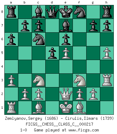 Last move : 1-0 2015 January 30 18:13:38 [Event "FICGS__CHESS__CLASS_C__000217"] [Site "FICGS"] [Date "2015.01.22"] [Round "1"] [White "Zemlyanov,Sergey"] [Black "Cirulis,Ilmars"] [Result "1-0"] [WhiteElo "1686"] [BlackElo "1739"] 1.e4 Nc6 2.d4 e6 3.Nf3 d5 4.e5 Nge7 5.h4 f6 6.Nc3 fxe5 7.dxe5 a6 8.a3 Ng6 9.Qe2 Be7 10.h5 Nf8 11.Rh3 1-0 KP : Nimzovich defense Player White won this chess game. Follow this game move after move (download)A thorough understanding of the typical mating continuations makes the most complicated sacrificial combinations leading up to them not only not difficult, but almost a matter of course. (Siegbert Tarrasch) Jeder weiß, dass Gasprom Putins persönliches Machtinstrument ist. Die Firma wird vom Kreml aus geleitet und wird schon deshalb nie transparent sein. (Garry Kasparov) El Ajedrez es un mar en el cual un mosquito puede beber y un elefante puede bañarse. (Refrán Hindú) Le thème de l'attaque double intervient d'une manière ou d'une autre dans l'immense majorité des combinaisons. (Youri Averbakh) A good aphorism is too hard for the tooth of time, and is not worn away with the centuries, although it serves as food for every speech. (Friedrich Nietzsche)