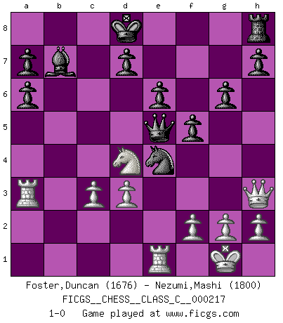 Last move : 1-0 2015 April 4 5:19:11 [Event "FICGS__CHESS__CLASS_C__000217"] [Site "FICGS"] [Date "2015.01.22"] [Round "1"] [White "Foster,Duncan"] [Black "Nezumi,Mashi"] [Result "1-0"] [WhiteElo "1676"] [BlackElo "1800"] 1.e4 c5 2.a3 e6 3.b4 cxb4 4.axb4 Bxb4 5.Bb2 f6 6.Qh5+ g6 7.Qh4 Be7 8.Nf3 Qb6 9.Bd4 Qc6 10.Bc3 Na6 11.Bxa6 bxa6 12.O-O Bb7 13.Re1 O-O-O 14.Nd4 Qc7 15.Ba5 Qe5 16.c3 f5 17.Qh3 Nf6 18.Bxd8 Kxd8 19.Na3 Nxe4 20.d3 Bxa3 21.Rxa3 1-0 Sicilian defense Kingside Castling by player White (move 12) Queenside Castling by player Black (move 13) Player White won this chess game. Follow this game move after move (download)An attack on the wing should be met by play in the center. (Nimzovitch) Ivan Sokolov treibt mich als Beifahrer an mit go Loeky go - . (Loek van Wely) Las leyes del Ajedrez no permiten una libre elección: tienes que mover quieras o no. (Emanuel Lasker) Vouloir jouer aux échecs contre soi-même est aussi paradoxal que vouloir marcher sur son ombre. (Stefan Zweig) Begin at the beginning and go on till you come to the end; then stop. (Lewis Carrol, Alice in Wonderland)
