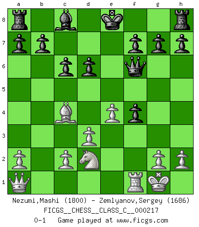 Last move : 0-1 2015 April 4 5:19:11 [Event "FICGS__CHESS__CLASS_C__000217"] [Site "FICGS"] [Date "2015.01.22"] [Round "1"] [White "Nezumi,Mashi"] [Black "Zemlyanov,Sergey"] [Result "0-1"] [WhiteElo "1800"] [BlackElo "1686"] 1.e4 e5 2.Nf3 Nc6 3.Bb5 Nf6 4.d3 Bc5 5.O-O Nd4 6.Nxd4 Bxd4 7.Bg5 Bxb2 8.Bxf6 Qxf6 9.Nd2 Bxa1 10.Qxa1 c6 11.Bc4 d6 12.f4 exf4 0-1 Ruy Lopez : Berlin defense Kingside Castling by player White (move 5) Player Black won this chess game. Follow this game move after move (download)Fischer is completely natural. He plays no roles. He's like a child. Very, very simple. (Zita Rajcsanyi) Heutzutage gewinnt im Turnier nicht derjenige Spieler, der weitreichende Pläne entwirft, sondern einfach jener, der Zug um Zug kämpft. (David Bronstein) La última cosa en que Fischer estaba interesado era en tonterías, siempre y cuando el Ajedrez estuviera involucrado. (Elie Agur) Les échecs, c'est l'art d'analyser. (Mikhail Botvinnik) Live, lose, and learn, by observing your opponent how to win. (Amber Steenbock)