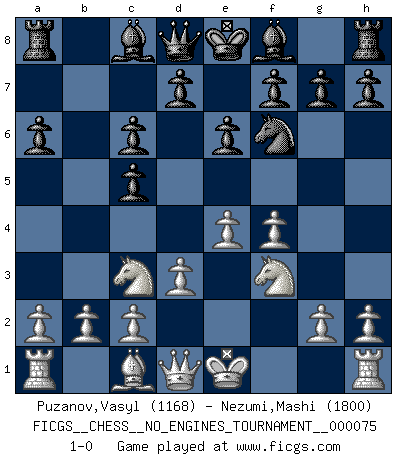 Last move : 1-0 2015 March 13 1:19:59 [Event "FICGS__CHESS__NO_ENGINES_TOURNAMENT__000075"] [Site "FICGS"] [Date "2015.01.22"] [Round "1"] [White "Puzanov,Vasyl"] [Black "Nezumi,Mashi"] [Result "1-0"] [WhiteElo "1168"] [BlackElo "1800"] 1.e4 c5 2.f4 e6 3.Nf3 Nc6 4.Nc3 Nf6 5.Bb5 a6 6.Bxc6 bxc6 7.d3 1-0 This chess game has been lost on time (started : 2015.01.22 23:40:58) Sicilian : Grand Prix attack Player White won this chess game. Follow this game move after move (download)If I win a tournament, I win it by myself. I do the playing. Nobody helps me. (Bobby Fischer) Es hat in meinem Leben Zeiten gegeben, da ich sehr nahe daran war zu glauben, daß ich auch nicht eine einzige Schachpartie verlieren könnte. (José Raúl Capablanca) En posiciones complicadas, Bobby Fischer pocas veces tuvo que temer de cualquiera. (Paul Keres) Il vaut mieux sacrifier les pièces de l'adversaire. (Xavier Tartacover) The meaning of life is that it is to be lived, and it is not to be traded and conceptualized and squeezed into a pattern of systems. (Bruce Lee)