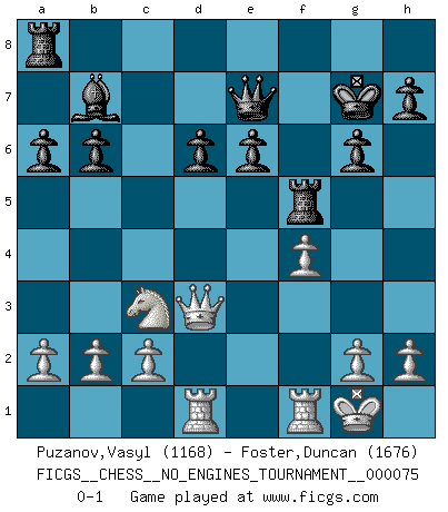 Last move : 0-1 2015 March 30 19:42:31 [Event "FICGS__CHESS__NO_ENGINES_TOURNAMENT__000075"] [Site "FICGS"] [Date "2015.01.22"] [Round "1"] [White "Puzanov,Vasyl"] [Black "Foster,Duncan"] [Result "0-1"] [WhiteElo "1168"] [BlackElo "1676"] 1.e4 e6 2.d4 b6 3.Nc3 Bb7 4.Bd3 a6 5.Nge2 g6 6.O-O Bg7 7.Be3 Ne7 8.f3 O-O 9.Qd2 d6 10.Rad1 Nd7 11.Bh6 c5 12.Bxg7 Kxg7 13.f4 f5 14.dxc5 Nxc5 15.exf5 Nxd3 16.Qxd3 Nxf5 17.Nd4 Qe7 18.Nxf5+ Rxf5 0-1 French defense Kingside Castling by player White (move 6) Kingside Castling by player Black (move 8) Player Black won this chess game. Follow this game move after move (download)Play the opening like a book, the middle game like a magician, and the endgame like a machine. (Spielmann) Moralische Siege zählen nicht. (Savielly Grigorievitsch Tartakower) El ganador de una partida es aquel jugador que hace el penúltimo error. (Savielly Tartakover) Les ravages du H expliquent la différence de niveau entre Tal et Thal [Abergel]. He is a liar. I just don't know what the lie is yet. (Horatio Caine, C.S.I. Miami)