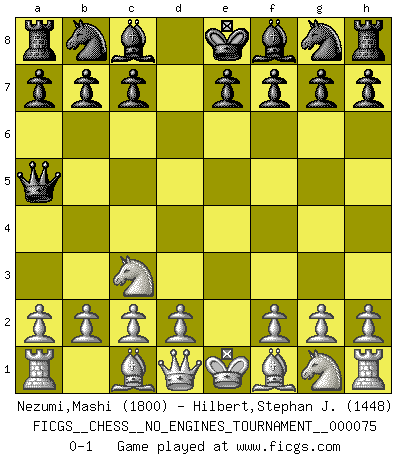 Last move : 0-1 2015 March 17 13:59:49 [Event "FICGS__CHESS__NO_ENGINES_TOURNAMENT__000075"] [Site "FICGS"] [Date "2015.01.22"] [Round "1"] [White "Nezumi,Mashi"] [Black "Hilbert,Stephan J."] [Result "0-1"] [WhiteElo "1800"] [BlackElo "1448"] 1.e4 d5 2.exd5 Qxd5 3.Nc3 Qa5 0-1 This chess game has been lost on time (started : 2015.01.22 23:40:58) Scandinavian (centre counter) defense Player Black won this chess game. Follow this game move after move (download)In Fischer's hands, a slight theoretical advantage is as good a being a Queen ahead. (Isaac Kashdan) Modernes Schach sorgt sich zuviel um Dinge wie Bauernstruktur usw. Vergessen Sie das, Schachmatt beendet das Spiel! (Nigel Short) Tu eres para mi la Reina en d8 y yo soy el Peón en d7!!. (GM Eduard Gufeld) Le temps de noter son nom sur la feuille de partie, j'étais déjà en zeitnot ! D'un modeste amateur apparié lors de la première ronde d'un open contre le grand-maître Azmaïparashvili. Hardware: the parts of a computer that can be kicked. (Jeff Persis)