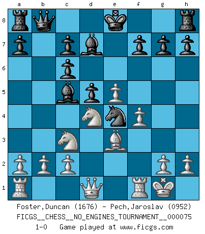 Last move : 1-0 2015 May 20 10:40:53 [Event "FICGS__CHESS__NO_ENGINES_TOURNAMENT__000075"] [Site "FICGS"] [Date "2015.01.22"] [Round "1"] [White "Foster,Duncan"] [Black "Pech,Jaroslav"] [Result "1-0"] [WhiteElo "1676"] [BlackElo "0952"] 1.e4 e5 2.Nf3 Nc6 3.d4 exd4 4.Bc4 Nf6 5.e5 d5 6.Bb5 Ne4 7.Nxd4 Bd7 8.Bxc6 bxc6 9.O-O Bc5 10.f3 Ng5 11.f4 Ne4 12.Be3 Qb8 13.Nc3 1-0 This chess game has been lost on time (started : 2015.01.22 23:40:58) Scotch gambit : Dubois-Reti defense Kingside Castling by player White (move 9) Player White won this chess game. Follow this game move after move (download)There's never before been a Chess player with such a thorough knowledge of the intricacies of the game and such an absolutely indomitable will to win. I think Bobby is the greatest player that ever lived. (Lisa Lane) Besser ein falscher Plan, logisch durchgeführt, als gar kein Plan. (Viktor Kortschnoi) Es muy difícil jugar en contra de la teoría de Einstein. - en su primera derrota en contra de Fischer (Mikhail Tal) Il n'y a plus de joueurs du niveau de Jacob Murray dont la seule quête est le beau jeu, le plaisir de voir les pièces construire quelque chose. Sur 10 idées à la minute, 9 seront sans intérêt, la dernière s'avèrera géniale. (Christian Bauer) A specialist learns more and more about less and less until he knows everything about nothing. (Nicholas Murray Butler)