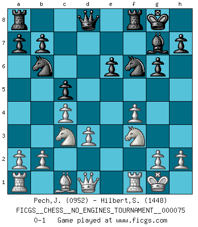 Last move : 0-1 2015 May 28 11:24:0 [Event "FICGS__CHESS__NO_ENGINES_TOURNAMENT__000075"] [Site "FICGS"] [Date "2015.01.22"] [Round "1"] [White "Pech,Jaroslav"] [Black "Hilbert,Stephan J."] [Result "0-1"] [WhiteElo "0952"] [BlackElo "1448"] 1.e4 c5 2.f4 d5 3.exd5 Nf6 4.Bb5+ Bd7 5.Bxd7+ Nbxd7 6.c4 Nb6 7.Nc3 g6 8.Nf3 Bg7 9.d3 O-O 10.O-O e6 11.dxe6 fxe6 0-1 This chess game has been lost on time (started : 2015.01.22 23:40:58) Sicilian : Grand Prix attack Kingside Castling by player Black (move 9) Kingside Castling by player White (move 10) Player Black won this chess game. Follow this game move after move (download)Is Bobby Fischer quite sane ? (Salo Flohr) Immer nach dem besten Zug zu suchen ist ziemlich unpraktisch. (Nigel Short) Un buen sacrificio es aquel que aunque no sea necesariamente sólido, deja a tu oponente aturdido y confuso. (Rudolph Spielmann) Karpov est une pièce de musée. (Garry Kasparov) Go and wake up your luck. (Persian saying)