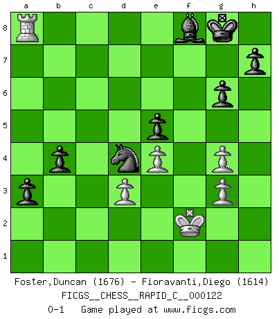 Last move : 0-1 2015 April 4 13:16:10 [Event "FICGS__CHESS__RAPID_C__000122"] [Site "FICGS"] [Date "2015.01.23"] [Round "1"] [White "Foster,Duncan"] [Black "Fioravanti,Diego"] [Result "0-1"] [WhiteElo "1676"] [BlackElo "1614"] 1.e4 c5 2.a3 g6 3.b4 Bg7 4.Nc3 d6 5.g3 Nc6 6.Rb1 cxb4 7.axb4 Nf6 8.Bg2 O-O 9.Nge2 e5 10.O-O Bg4 11.h3 Be6 12.b5 Nd4 13.d3 Qd7 14.Kh2 d5 15.exd5 Nxd5 16.Ne4 Bf5 17.N4c3 Nxc3 18.Nxc3 Rac8 19.Bd2 Rfd8 20.b6 a5 21.Rb2 a4 22.Ne4 Bxe4 23.Bxe4 Ra8 24.Ra2 Ra6 25.c3 Nb3 26.Be3 f5 27.Bg2 Qf7 28.c4 f4 29.Bd5 Rxd5 30.cxd5 fxe3 31.fxe3 Qxd5 32.e4 Qe6 33.Rc2 Rxb6 34.Qg4 Qxg4 35.hxg4 Rf6 36.Rc8+ Rf8 37.R1xf8+ Bxf8 38.Kg2 b5 39.Re8 a3 40.Ra8 Nd4 41.Kf2 b4 0-1 Sicilian defense Kingside Castling by player Black (move 8) Kingside Castling by player White (move 10) Player Black won this chess game. Follow this game move after move (download)Some sacrifices are sound; the rest are mine. (Mikhail Tal) Fischer machte Schach einfach zu einer aufregenden Sache, wann immer er sich ans Brett setzte. (Raymond Keene) Una buena memoria, concentración, imaginación y una fuerte voluntad, se requiere para llegar a ser un buen jugador. (Bobby Fischer) RxDa4 pat (...) Good decisions come from experience, and experience comes from bad decisions. (Anonymous)