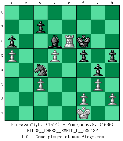 Last move : 1-0 2015 May 2 21:5:37 [Event "FICGS__CHESS__RAPID_C__000122"] [Site "FICGS"] [Date "2015.01.23"] [Round "1"] [White "Fioravanti,Diego"] [Black "Zemlyanov,Sergey"] [Result "1-0"] [WhiteElo "1614"] [BlackElo "1686"] 1.e4 e5 2.Nf3 Nc6 3.Bb5 Nf6 4.O-O Nxe4 5.Re1 Nd6 6.Nxe5 Be7 7.Bxc6 dxc6 8.d3 O-O 9.Nc3 Re8 10.Bf4 Be6 11.Qd2 c5 12.Rad1 Nf5 13.a4 a6 14.a5 Nd4 15.Ne4 f6 16.Nc4 Bf8 17.c3 Nc6 18.Qc2 Qd7 19.Qa4 Rad8 20.Be3 Qf7 21.Bxc5 Bxc4 22.dxc4 Rxe4 23.Rxe4 Rxd1+ 24.Qxd1 Bxc5 25.Qd5 Qxd5 26.cxd5 Ne7 27.Rc4 Bd6 28.Rd4 Kf7 29.g3 g5 30.Kg2 h5 31.Rd3 Ng6 32.b4 f5 33.Rd1 Ne5 34.b5 Kf6 35.Re1 g4 36.bxa6 bxa6 37.Kf1 Nc4 38.Re6+ 1-0 This chess game has been lost on time (started : 2015.01.23 13:30:0) Ruy Lopez : Berlin defense, Open variation Kingside Castling by player White (move 4) Kingside Castling by player Black (move 8) Player White won this chess game. Follow this game move after move (download)Chess is the art of analysis. (Mikhail Botvinnik) Ein Buch ist ein Spiegel; wenn ein Affe hineinsieht, so kann kein Apostel heraus gucken. (Georg Christoph Lichtenberg) Prefiero perder una partida realmente buena, que ganar una mala. (David Levy) Pour se monter efficace, un Cavalier a besoin d'avant-postes ! Les Cavaliers font les meilleurs bloqueurs de pions passés. The large trees attract high winds. (Chinese proverb)