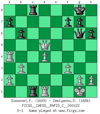 Last move : 0-1 2015 February 3 13:36:32 [Event "FICGS__CHESS__RAPID_C__000122"] [Site "FICGS"] [Date "2015.01.23"] [Round "1"] [White "Simonnet,Franck"] [Black "Zemlyanov,Sergey"] [Result "0-1"] [WhiteElo "1609"] [BlackElo "1686"] 1.d4 Nf6 2.Nf3 e6 3.e3 b6 4.Bd3 d5 5.Nbd2 c5 6.b3 Bb7 7.Bb2 Bd6 8.Ne5 O-O 9.O-O Nc6 10.Nxc6 Bxc6 11.c4 cxd4 12.exd4 Rc8 13.Rc1 Bb7 14.Re1 Qe7 15.Qe2 Ba3 16.Nf1 Rfd8 17.Ne3 Rc7 18.Bxa3 Qxa3 19.Red1 h6 20.f3 dxc4 21.Rxc4 Qd6 22.Ra4 Nd5 23.Nxd5 Bxd5 24.Be4 Rdc8 25.Bxd5 exd5 26.Qe5 Qg6 27.Qxd5 Rc1 0-1 Queen's pawn : Yusupov-Rubinstein system Kingside Castling by player Black (move 8) Kingside Castling by player White (move 9) Player Black won this chess game. Follow this game move after move (download)You sit at the board and suddenly your heart leaps. Your hand trembles to pick up the piece and move it. But what Chess teaches you is that you must sit there calmly and think about whether it's really a good idea and whether there are other better ideas. (Stanley Kubrick) Schach ist ein schwarz-weisser Dschungel. (Garry Kasparov) El ganador de una partida es aquel jugador que hace el penúltimo error. (Savielly Tartakover) Ce n'est pas pour s'amuser qu'il joue aux échecs : il célèbre un culte. (Vladimir Nabokov) How many people work in NATO Headquarters ? - About half of them. (Dirk Stikker, NATO general secretary)