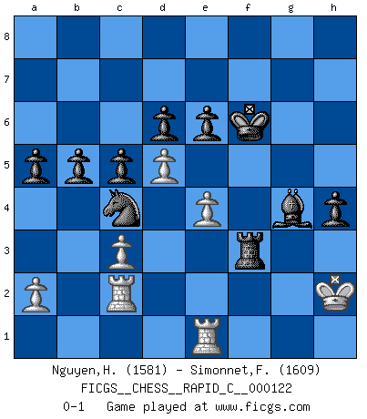 Last move : 0-1 2015 February 23 1:55:16 [Event "FICGS__CHESS__RAPID_C__000122"] [Site "FICGS"] [Date "2015.01.23"] [Round "1"] [White "Nguyen,Hao Nhien"] [Black "Simonnet,Franck"] [Result "0-1"] [WhiteElo "1581"] [BlackElo "1609"] 1.d4 f5 2.c4 Nf6 3.Nc3 g6 4.f3 Bg7 5.e4 c5 6.d5 fxe4 7.fxe4 d6 8.h3 O-O 9.Nf3 Nh5 10.Be3 Ng3 11.Rg1 Qa5 12.Qc2 Bxh3 13.Bd2 Nxf1 14.Kxf1 Rxf3+ 15.Ke2 Rxc3 16.Bxc3 Bxc3 17.bxc3 Bg4+ 18.Kd3 Nd7 19.Qb3 Ne5+ 20.Ke3 Qa6 21.Rgb1 b6 22.Qb5 Nxc4+ 23.Kf4 Qxb5 24.Rxb5 Bd7 25.R5b1 Rf8+ 26.Kg3 Kg7 27.Re1 h5 28.Rab1 g5 29.Re2 Kg6 30.Rbe1 Bg4 31.Rc2 b5 32.Kh2 e6 33.Kg1 h4 34.Kh2 Nb6 35.Rd2 Nc4 36.Rc2 a5 37.Kg1 Rf4 38.Kh2 Kf6 39.g3 Rf3 40.gxh4 gxh4 0-1 Dutch with c4 & Nc3 Kingside Castling by player Black (move 8) Player Black won this chess game. Follow this game move after move (download)In Chess, as it is played by masters, chance is practically eliminated. (Emanuel Lasker) Aljechin war kein Nazi. Er war ein Opportunist. Ein schrecklicher Mann. Er liebte Geld über alles und würde für Geld ein Jude, ein Katolik oder ein Protestant werden. (Miguel Najdorf) No hay un Gran Maestro de Ajedrez que sea normal; solo se diferencían ellos por la magnitud de su locura. (Viktor Korchnoi) Votre prénom est 'Tactique', votre deuxième prénom est 'Tactique' et votre nom est 'Tactique'. (Ken Smith) I'm extremely disappointed. I send you out for exciting, new designer drugs, you come back with tomato sauce. (Gregory House, House M.D.)
