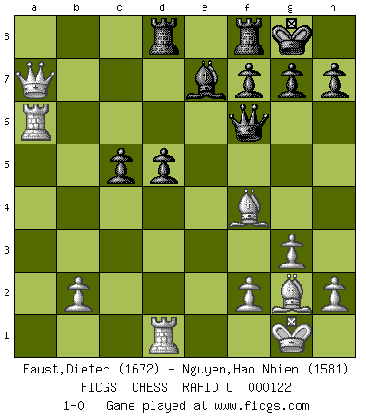 Last move : 1-0 2015 February 15 3:12:11 [Event "FICGS__CHESS__RAPID_C__000122"] [Site "FICGS"] [Date "2015.01.23"] [Round "1"] [White "Faust,Dieter"] [Black "Nguyen,Hao Nhien"] [Result "1-0"] [WhiteElo "1672"] [BlackElo "1581"] 1.d4 Nf6 2.Nf3 d5 3.g3 e6 4.Bg2 c5 5.c4 Nc6 6.O-O dxc4 7.Ne5 Nxe5 8.dxe5 Nd5 9.Nd2 b5 10.a4 Bd7 11.axb5 Bxb5 12.Nxc4 Bxc4 13.Qa4+ Qd7 14.Qxc4 Be7 15.Rd1 Rd8 16.Qa6 O-O 17.e4 Qc7 18.exd5 exd5 19.Qxa7 Qxe5 20.Bf4 Qf6 21.Ra6 1-0 Queen's pawn game Kingside Castling by player White (move 6) Kingside Castling by player Black (move 16) Player White won this chess game. Follow this game move after move (download)Fischer sacrificed virtually everything most of us weakies (to use his term) value, respect, and cherish, for the sake of an artful, often beautiful board game, for the ambivalent privilege of being its greatest master. (Paul Kollar) Mit sehr nachdenklichem Gesicht schreitet Bobby durch den Turniersaal. Was ist passiert?, fragt Lombardy. Ich stehe schlecht, antwortet Fischer. Lombardy: Dann biete doch einfach Remis an. Fischer: So schlecht stehe ich nun auch wieder nicht! (Robert James Fischer) No volvere nunca a jugar contigo. Has insultado a mi amigo. - cuando un oponente se maldijo por una mala jugada (Miguel Najdorf) La vie est comme un jeu d'échecs : nous esquissons un plan, mais celui-ci est tributaire de ce que daignent faire l'adversaire aux échecs et le destin dans la vie. (Arthur Schopenhauer) A bird doesn't sing because it has an answer, it sings because it has a song. (Maya Angelou)
