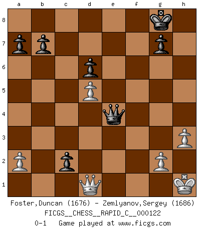 Last move : 0-1 2015 April 3 21:31:30 [Event "FICGS__CHESS__RAPID_C__000122"] [Site "FICGS"] [Date "2015.01.23"] [Round "1"] [White "Foster,Duncan"] [Black "Zemlyanov,Sergey"] [Result "0-1"] [WhiteElo "1676"] [BlackElo "1686"] 1.e4 e5 2.Nf3 Nc6 3.d4 exd4 4.Bc4 Bc5 5.c3 Nf6 6.cxd4 Bb4+ 7.Nc3 Nxe4 8.O-O Bxc3 9.d5 Bf6 10.Re1 Ne7 11.Rxe4 d6 12.Bg5 Bxg5 13.Nxg5 O-O 14.Nxh7 Bf5 15.Rh4 Re8 16.Qh5 Ng6 17.Rd4 Re5 18.f4 Nxf4 19.Rxf4 Bg6 20.Nf6+ Qxf6 21.Qf3 Qg5 22.Rf1 Rae8 23.Bb5 c6 24.Bd3 Re3 25.Bxg6 Qxg6 26.Qd1 Re2 27.R4f2 Rxf2 28.Rxf2 c5 29.Qb3 Qb1+ 30.Rf1 Re1 31.Qf3 Rxf1+ 32.Qxf1 Qxb2 33.Qe1 Qd4+ 34.Kh1 c4 35.h3 c3 36.Qe8+ Kh7 37.Qxf7 Qe4 38.Qh5+ Kg8 39.Qd1 c2 0-1 Scotch gambit Kingside Castling by player White (move 8) Kingside Castling by player Black (move 13) Player Black won this chess game. Follow this game move after move (download)The essence of Chess is thinking about what Chess is. (David Bronstein) Dass jemand wie Surab Asmaiparaschwili, der selbst Elopunkte gekauft hat , Vize-Präsident der Fide werden konnte, sagt schon einges über den Zustand dieser Organisation aus. (Joel Lautier) La señal de un Gran Maestro es su habilidad de ganar una partida rápidamente y sin dolor. (Irving Chernev) L'action d'une oeuvre littéraire se déroule sur un champ de bataille. Les masques et les types du drame moderne correspondent aux pièces du jeu d'échecs. L'intrigue correspond aux coups et aux gambits, c'est à dire aux techniques du jeu telles qu'utilisées et interprétées par les joueurs. Les tactiques et les péripéties [mouvements] correspondent aux coups exécutés par l'adversaire. (Viktor Shklovsky) It's not the will to win, but the will to prepare to win that makes the difference. (Bear Bryant)