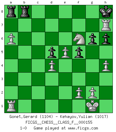 Last move : 1-0 2015 January 27 21:18:59 [Event "FICGS__CHESS__CLASS_F__000155"] [Site "FICGS"] [Date "2015.01.23"] [Round "1"] [White "Gonet,Gerard"] [Black "Kehayov,Yulian"] [Result "1-0"] [WhiteElo "1104"] [BlackElo "1017"] 1.d4 d5 2.e4 e6 3.c4 c6 4.e5 g6 5.Nc3 Bg7 6.Nf3 Ne7 7.cxd5 cxd5 8.Bb5+ Bd7 9.Qa4 Bxb5 10.Qxb5+ Nbc6 11.Qxb7 Qb8 12.Qa6 Nc8 13.Qxc6+ Ke7 14.O-O Qb6 15.Qxb6 Nxb6 16.Nb5 a6 17.Nd6 Nc8 18.Nxc8+ Raxc8 19.Bd2 Rhe8 20.Bb4+ Kd7 21.Nd2 Bf8 22.Bxf8 Rxf8 23.b4 Rb8 24.Rfb1 Kc6 25.a4 Rb7 26.Rc1+ Kd7 27.Nb3 Rxb4 28.Nc5+ Ke7 29.Nxa6 Rb6 30.Nc5 Rc8 31.a5 R6b8 32.a6 Ra8 33.Rcb1 f5 34.Rb7+ Kf8 35.Nxe6+ Kg8 36.h4 Re8 37.Ng5 h6 38.Nh7 Kh8 39.Nf6 Reb8 40.Rh7+ 1-0 Blackmar gambit Kingside Castling by player White (move 14) Player White won this chess game. Follow this game move after move (download)Chess is a terrific way for kids to build self image and self esteem. (Saudin Robovic) Wir können eben der zündenden Macht des Opfers nicht wiederstehen, denn die Begeisterung für das Opfer liegt in der Natur des Menschen. (Rudolf Spielmann) A la fecha, Fischer esta simplemente un nivel arriba de todos los mejores jugadores de Ajedrez del mundo. (John Jacobs) Demandez au pauvre Cg1 ce qu'il en pense. Eduard Gufeld à propos de la variante Saemisch de l'Est-Indienne. It is not enough to be a good player... you must also play well. (Siegbert Tarrasch)