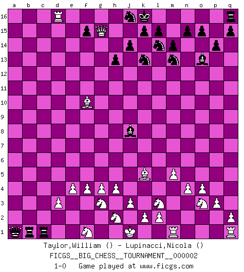 Last move : 1-0 2007 March 15 0:43:20 [Event "FICGS__BIG_CHESS__TOURNAMENT__000002"] [Site "FICGS"] [Date "2007.02.28"] [Round "1"] [White "Taylor,William"] [Black "Lupinacci,Nicola"] [Result "1-0"] [WhiteElo ""] [BlackElo ""] 1.n2-n4 p15-p14 2.f2-f4 o16-p15 3.g2-g4 g15-g13 4.o2-o4 m15-m14 5.h1-d5 l16-n14 6.d5-n5 d15-d14 7.b1-c3 k16-l14 8.p1-o3 j15-k13 9.g1-f3 f16-g15 10.h3-h4 g15-e13 11.n5-p5 g16-f14 12.f1-n8 h14-h13 13.p2-p3 c16-k9 14.e2-e4 n14-o13 15.m2-m4 b16-c14 16.d2-d3 p16-o14 17.l1-n3 o14-m13 18.k1-l3 h15-k14 19.c1-e3 e13-j9 20.a1-b1 a16-b16 21.o1-g8 j9-c3 22.b2-c3 p15-c3 23.e3-d2 c3-d2 24.f3-d2 f14-g12 25.b1-b13 e16-g16 26.e1-b1 b15-b14 27.b13-g13 h16-f14 28.g13-g16 b16-g16 29.p5-e5 g12-h14 30.g8-m13 k14-m13 31.e5-e12 f14-g14 32.e12-c14 k9-j8 33.c14-c15 g16-e16 34.c15-a15 j16-j15 35.b1-b14 e16-a16 36.a15-e15 a16-a2 37.b14-d14 g14-a8 38.e15-f14 a2-c2 39.d2-f1 m16-b16 40.m4-m5 b16-b1 41.n3-f10 a8-a1 42.f14-g15 j15-k16 43.d14-d16 h14-j16 44.j2-g3 c2-c1 45.n8-k5 1-0 Follow this game move after move (download)You must take your opponent into a deep dark forest where 2+2=5, and the path leading out is only wide enough for one. (Mikhail Tal) Im Blitz ist es einfacher mit einer Figur weniger anzugreifen, als sich mit einer Mehrfigur zu verteidigen. (Mikhail Nekhemyevich Tal) Muchos se han convertido en Maestros de Ajedrez, nadie se ha convertido en el Maestro del Ajedrez. (Siegbert Tarrasch) Le pion, dans sa simplicité, marche droit devant lui, mais lorsqu'il prend, il le fait obliquement? Ainsi l'homme, tant qu'il reste pauvre, marche dans la droiture et vit honnêtement, mais lorsqu'il recherche les honneurs, il flatte, se parjure et, par les voies obliques, cherche une position supérieure sur l'échiquier du monde. (Jean de Galles) To send light into the darkness of men's hearts - such is the duty of the artist. (Schumann)