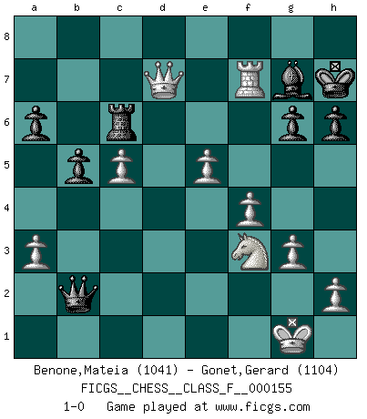 Last move : 1-0 2015 February 2 18:36:56 [Event "FICGS__CHESS__CLASS_F__000155"] [Site "FICGS"] [Date "2015.01.23"] [Round "1"] [White "Benone,Mateia"] [Black "Gonet,Gerard"] [Result "1-0"] [WhiteElo "1041"] [BlackElo "1104"] 1.Nf3 Nf6 2.g3 g6 3.d4 Bg7 4.e4 d6 5.Bg2 O-O 6.O-O e5 7.dxe5 dxe5 8.Nxe5 Qe7 9.Nc4 Nc6 10.Re1 Re8 11.Bg5 h6 12.Bxf6 Qxf6 13.c3 Be6 14.Ne3 Rad8 15.Qc2 Ne5 16.Nd2 Nd3 17.Rf1 Bd7 18.Qxd3 Bh3 19.Qe2 Qe6 20.Bxh3 Qxh3 21.Rad1 a6 22.Nd5 Re5 23.Nxc7 Rh5 24.f4 Rd7 25.Nf3 Rxc7 26.Rd8+ Kh7 27.Rfd1 Bf6 28.R8d5 Rxd5 29.Rxd5 Qe6 30.Qd3 Re7 31.e5 Bg7 32.c4 Qb6+ 33.c5 Qxb2 34.a3 Re6 35.Rd7 b5 36.Rxf7 Rc6 37.Qd7 1-0 Reti : King's Indian attack Kingside Castling by player Black (move 5) Kingside Castling by player White (move 6) Player White won this chess game. Follow this game move after move (download)There is only one thing Fischer does in Chess without pleasure: to lose ! (Boris Spassky) Der Partner hat auch seine Existenzberechtigung. (Savielly Grigorievitsch Tartakower) Juega la Apertura como un libro, el Juego Medio como un mago y los Finales como una máquina. (Spielmann) Celui qui prend des risques peut perdre, celui qui n'en prend pas perd toujours. (Xavier Tartacover) There are two kinds of people in the world, my friend. Those who have a loaded gun and those who dig. You dig ! (Blondie in The Good, The Bad and The Ugly)