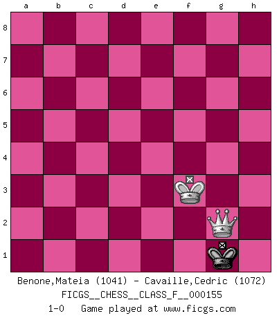 Last move : 1-0 2015 February 11 17:2:14 [Event "FICGS__CHESS__CLASS_F__000155"] [Site "FICGS"] [Date "2015.01.23"] [Round "1"] [White "Benone,Mateia"] [Black "Cavaille,Cedric"] [Result "1-0"] [WhiteElo "1041"] [BlackElo "1072"] 1.e4 c5 2.Nf3 e6 3.d4 cxd4 4.Nxd4 Nc6 5.Nc3 Bc5 6.Nb3 Bb4 7.Bd2 Nf6 8.Bd3 a6 9.O-O O-O 10.a3 Be7 11.Kh1 b5 12.f4 d6 13.Qf3 Bb7 14.Qg3 Qb6 15.Be3 Qc7 16.Rae1 a5 17.Nxb5 Qd8 18.Qh3 Re8 19.Bd2 a4 20.N3d4 Nxd4 21.Nxd4 Ba6 22.c4 d5 23.exd5 exd5 24.Nc6 Qc7 25.Nxe7+ Rxe7 26.Rxe7 Qxe7 27.Re1 Qc5 28.cxd5 Bxd3 29.Qxd3 Qxd5 30.Qxd5 Nxd5 31.Kg1 g6 32.Re5 Nf6 33.h3 h5 34.Bc3 Kg7 35.Rc5 Ra6 36.g4 hxg4 37.hxg4 Kf8 38.Rc8+ Ke7 39.Rc7+ Ke6 40.g5 Nd5 41.Rc4 Nxc3 42.bxc3 Kf5 43.Kf2 f6 44.gxf6 Kxf6 45.Kf3 Kf5 46.Rc5+ Ke6 47.Ke4 Kd6 48.Rg5 Ke7 49.c4 Kf7 50.Rb5 Rc6 51.c5 Ke6 52.Rb6 Rxb6 53.cxb6 Kd6 54.b7 Kc7 55.Ke5 Kxb7 56.Kf6 Kc6 57.Kxg6 Kc5 58.f5 Kc4 59.f6 Kb3 60.f7 Kxa3 61.f8Q+ Kb2 62.Qb4+ Kc1 63.Qxa4 Kd2 64.Kf5 Kd3 65.Kf4 Kc3 66.Ke4 Kd2 67.Qb3 Ke2 68.Qc2+ Kf1 69.Kf3 Kg1 70.Qg2+ 1-0 Sicilian : Taimanov variation Kingside Castling by player White (move 9) Kingside Castling by player Black (move 9) 10 pieces endgame at move 44 : White KRPPPP , Black KRPP WHITE : King + 1 Rook 4 Pawns BLACK : King + 1 Rook 2 Pawns 9 pieces endgame at move 44 : White KRPPP , Black KRPP WHITE : King + 1 Rook 3 Pawns BLACK : King + 1 Rook 2 Pawns 8 pieces endgame at move 52 : White KPPP , Black KRPP WHITE : King + 3 Pawns BLACK : King + 1 Rook 2 Pawns 7 pieces endgame at move 53 : White KPPP , Black KPP WHITE : King + 3 Pawns BLACK : King + 2 Pawns 6 pieces endgame at move 55 : White KPP , Black KPP WHITE : King + 2 Pawns BLACK : King + 2 Pawns 5 pieces endgame at move 57 : White KPP , Black KP WHITE : King + 2 Pawns BLACK : King + 1 Pawn 4 pieces endgame at move 60 : White KP , Black KP WHITE : King + 1 Pawn BLACK : King + 1 Pawn Promotion Queen by player White (move 61) 3 pieces endgame at move 63 : White KQ , Black K WHITE : King + 1 Queen BLACK : King + Player White won this chess game. Follow this game move after move (download)Becoming successful at Chess allows you to discover your own personality. That's what I want for the kids I teach. (Saudin Robovic) Ein Isolani verdüstert die Stimmung auf dem ganzen Schachbrett. (Savielly Grigorievitsch Tartakower) Nada excita más a Grandes Maestros aburridos que una novedad teórica. (Dominic Lawson) Dans le domaine de la peinture, de la gravure et de la sculpture, dès la première décennie de notre siècle, les artistes abandonnent la représentation de la partie d'échecs pour se concentrer sur les pièces, sur les échiquiers et sur toutes les variations auxquelles les unes et les autres peuvent donner lieu. On passe en quelque sorte d'un thème social à un thème musical (au sens de la musica médiévale, c'est-à-dire d'une notion qui inclue le rythme, l'harmonie, la construction et la déconstruction, etc.). Graphiquement et picturalement, l'échiquier apparaît comme une structure ouverte, dynamique, d'une richesse infinie, autorisant toutes les combinatoires et débouchant sur des mouvements et des rythmes de nature exponentielle. (Michel Pastoureau) There are two major products that came out of Berkeley: LSD and UNIX. We do not believe this is to be a coincidence. (Jeremy S. Anderson)