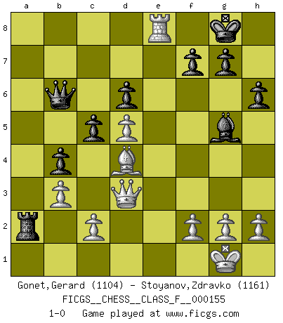 Last move : 1-0 2015 January 25 13:50:37 [Event "FICGS__CHESS__CLASS_F__000155"] [Site "FICGS"] [Date "2015.01.23"] [Round "1"] [White "Gonet,Gerard"] [Black "Stoyanov,Zdravko"] [Result "1-0"] [WhiteElo "1104"] [BlackElo "1161"] 1.d4 a6 2.a4 e6 3.e4 Nc6 4.d5 exd5 5.exd5 Nce7 6.Nc3 d6 7.Nf3 h6 8.Bd3 Bf5 9.Bxf5 Nxf5 10.O-O Be7 11.Re1 Nf6 12.Ne4 O-O 13.Qd3 Qd7 14.Bd2 c5 15.Bc3 Nxe4 16.Rxe4 b5 17.axb5 axb5 18.b3 b4 19.Bb2 Rxa1+ 20.Bxa1 Ra8 21.Re1 Ra2 22.Nd2 Bg5 23.Nc4 Nd4 24.Nb6 Qd8 25.Bxd4 Qxb6 26.Re8+ 1-0 Queen's pawn Kingside Castling by player White (move 10) Kingside Castling by player Black (move 12) Player White won this chess game. Follow this game move after move (download)The boy (then a 12 year old boy named Anatoly Karpov) doesn't have a clue about Chess, and there's no future at all for him in this profession. (Mikhail Botvinnik) Wir irren allesamt, nur jeder irrt anders. (Georg Christoph Lichtenberg) Prefiero perder una partida realmente buena, que ganar una mala. (David Levy) Vous savez, camarade Pachman, je n'éprouve pas de plaisir à être ministre, je jouerais plutôt aux échecs comme vous, ou alors ferais une révolution au Venezuela. (Che Guevara à Ludek Pachman, 'Checkmate in Prague', 1975) All art requires courage. (Anne Tucker)
