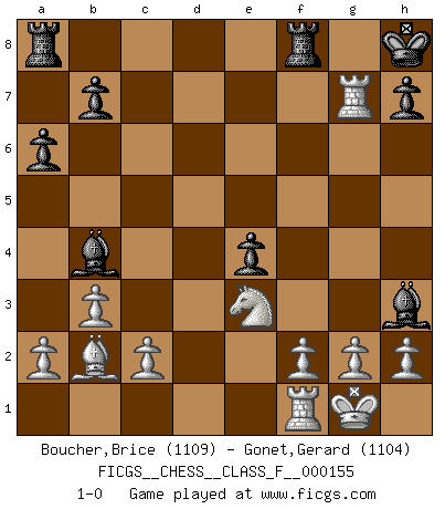 Last move : 1-0 2015 March 22 18:1:4 [Event "FICGS__CHESS__CLASS_F__000155"] [Site "FICGS"] [Date "2015.01.23"] [Round "1"] [White "Boucher,Brice"] [Black "Gonet,Gerard"] [Result "1-0"] [WhiteElo "1109"] [BlackElo "1104"] 1.e4 e5 2.Nf3 f5 3.Nxe5 Qf6 4.d4 d6 5.Nc4 fxe4 6.Nc3 Qg6 7.Ne3 Nf6 8.Be2 c6 9.d5 Be7 10.b3 O-O 11.Bb2 cxd5 12.Ncxd5 Nxd5 13.Nxd5 Bd8 14.Bc4 Kh8 15.Qe2 a6 16.Ne3 Nd7 17.O-O Nb6 18.Rad1 Nxc4 19.Qxc4 Be6 20.Qb4 Bh3 21.Rxd6 Qg5 22.Rg6 Be7 23.Rxg5 Bxb4 24.Rxg7 1-0 Comment by player 1 : Brice Boucher : bonjour ! bonne partie ;-) Latvian counter-gambit Kingside Castling by player Black (move 10) Kingside Castling by player White (move 17) Player White won this chess game. Follow this game move after move (download)We like to think. (Gary Kasparov) Später, ... hatte ich zunehmend Erfolg in entscheidenden Partien. Vielleicht weil ich eine einfache Wahrheit erkannte: nicht nur ich hatte Angst, auch mein Gegner. (Mikhail Nekhemyevich Tal) En el Ajedrez, tal como en la vida, las bendiciones de hoy pueden ser el veneno del mañana. (Assaic) Il n'y a plus de joueurs du niveau de Jacob Murray dont la seule quête est le beau jeu, le plaisir de voir les pièces construire quelque chose. Sur 10 idées à la minute, 9 seront sans intérêt, la dernière s'avèrera géniale. (Christian Bauer) Lottery : A tax on people who are bad at math. (Author unknown)