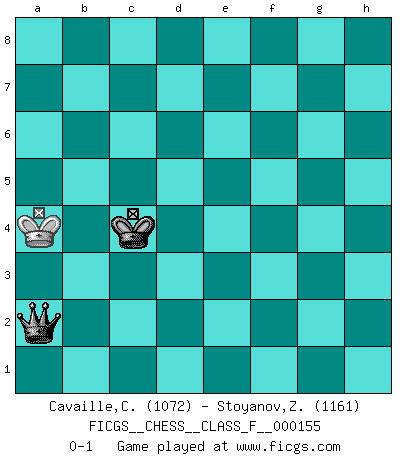 Last move : 0-1 2015 January 28 10:20:46 [Event "FICGS__CHESS__CLASS_F__000155"] [Site "FICGS"] [Date "2015.01.23"] [Round "1"] [White "Cavaille,Cedric"] [Black "Stoyanov,Zdravko"] [Result "0-1"] [WhiteElo "1072"] [BlackElo "1161"] 1.d4 h6 2.c4 e6 3.Nf3 a6 4.Nc3 Be7 5.g3 b6 6.Bg2 Bb7 7.e3 Nf6 8.Bd2 O-O 9.O-O c6 10.a3 b5 11.c5 d6 12.b4 d5 13.Ne5 Nbd7 14.Nxd7 Qxd7 15.a4 Rfe8 16.a5 Bd8 17.Qc2 e5 18.dxe5 Rxe5 19.e4 d4 20.Bf4 Re7 21.e5 Ng4 22.Na2 Nxe5 23.Bxe5 Rxe5 24.Rfe1 d3 25.Qd2 Bf6 26.Rxe5 Bxe5 27.Rd1 Rd8 28.Be4 Qd4 29.Qxd3 Qxd3 30.Rxd3 Rxd3 31.Bxd3 Bc8 32.Be4 Be6 33.Nc1 Bd5 34.f3 Bxe4 35.fxe4 f6 36.Kg2 Kf7 37.Kf3 Kg6 38.g4 Bxh2 39.Nd3 Kg5 40.Nf2 Be5 41.Nh3+ Kh4 42.Nf4 Bc3 43.Nd3 g5 44.e5 Bxe5 45.Nxe5 fxe5 46.Ke4 Kxg4 47.Kxe5 h5 48.Kd6 h4 49.Kxc6 h3 50.Kd7 h2 51.c6 h1Q 52.c7 Qh7+ 53.Kc8 Qg8+ 54.Kb7 Qf7 55.Kb8 Qe8+ 56.c8Q+ Qxc8+ 57.Kxc8 Kf4 58.Kb7 g4 59.Kxa6 g3 60.Kb7 g2 61.a6 g1Q 62.a7 Qg7+ 63.Kb8 Qf8+ 64.Kb7 Qxb4 65.a8Q Qe4+ 66.Ka7 Qxa8+ 67.Kxa8 b4 68.Ka7 b3 69.Ka6 b2 70.Ka5 b1Q 71.Ka4 Ke5 72.Ka5 Kd5 73.Ka4 Kc5 74.Ka3 Kc4 75.Ka4 Qa2+ 0-1 Queen's pawn Kingside Castling by player Black (move 8) Kingside Castling by player White (move 9) 10 pieces endgame at move 47 : White KPPP , Black KPPPPP WHITE : King + 3 Pawns BLACK : King + 5 Pawns 9 pieces endgame at move 49 : White KPPP , Black KPPPP WHITE : King + 3 Pawns BLACK : King + 4 Pawns Promotion Queen by player Black (move 51) Promotion Queen by player White (move 56) 8 pieces endgame at move 56 : White KPP , Black KQPPP WHITE : King + 2 Pawns BLACK : King + 1 Queen 3 Pawns 7 pieces endgame at move 57 : White KPP , Black KPPP WHITE : King + 2 Pawns BLACK : King + 3 Pawns 6 pieces endgame at move 59 : White KPP , Black KPP WHITE : King + 2 Pawns BLACK : King + 2 Pawns Promotion Queen by player Black (move 61) 5 pieces endgame at move 64 : White KP , Black KQP WHITE : King + 1 Pawn BLACK : King + 1 Queen 1 Pawn Promotion Queen by player White (move 65) 4 pieces endgame at move 66 : White K , Black KQP WHITE : King + BLACK : King + 1 Queen 1 Pawn 3 pieces endgame at move 67 : White K , Black KP WHITE : King + BLACK : King + 1 Pawn Promotion Queen by player Black (move 70) Player Black won this chess game. Follow this game move after move (download)What would Chess be without silly mistakes ? (Kurt Richter) Die jungen Leute sollen verstehen, dass sie noch etwas von mir lernen können und müssen. (Viktor Kortschnoi) En manos de Fischer's, una diminuta ventaja teórica es tan buena como tener una Reina de ventaja. (Isaac Kashdan) Le jeu d'échecs est comme rejeté hors du temps. (Antoine de Saint-Exupéry) For to win one hundred victories in one hundred battles is not the acme of skill. To subdue the enemy without fighting is the acme of skill. (Sun Tzu)