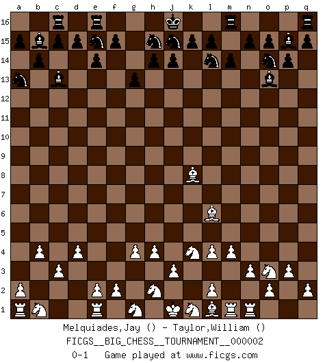 Last move : 0-1 2007 April 26 0:45:31 [Event "FICGS__BIG_CHESS__TOURNAMENT__000002"] [Site "FICGS"] [Date "2007.02.28"] [Round "1"] [White "Melquiades,Jay"] [Black "Taylor,William"] [Result "0-1"] [WhiteElo ""] [BlackElo ""] 1.g2-g4 b15-b14 2.p2-p3 c16-b15 3.p1-o3 p15-p14 4.j2-k4 o16-p15 5.c2-c3 e15-e14 6.h3-h4 f16-c13 7.n2-n3 m15-m14 8.f1-l6 b16-c14 9.h1-m5 g15-g13 10.o1-b13 g16-e15 11.d2-d4 l16-o13 12.m2-m4 k16-l14 13.c1-k8 a16-c16 14.k2-k3 h16-b10 15.b2-b4 b10-b13 16.q1-n1 p16-o14 17.m5-l4 b13-l4 18.k3-l4 c14-a13 0-1 This big chess game has been lost on time (started : 2007.02.28 17:14:10) Follow this game move after move (download)In order to improve your game, you must study the endgame before everything else, for whereas the endings can be studied and mastered by themselves, the middle game and the opening must be studied in relation to the endgame. (Jose Raul Capablanca) Lisa Lane, amerikanische Schachmeisterin, hatte Fischer einmal als stärksten lebenden Spieler bezeichnet. Antwort: Das ist richtig, aber Lisa Lane ist eigentlich nicht in der Lage, das zu beurteilen. (Robert James Fischer) Un entendimiento a fondo de las continuaciones típicas del mate, hace de las combinaciones de sacrificio mas complicadas conducirlas a ellas no solo sin dificultad, sino casi de una manera natural. (Siegbert Tarrasch) Un footballeur joue avec ses pieds, parfois avec sa tête. Un joueur d'échecs ne joue qu'avec sa tête. Et quand il ne joue plus, il meurt. (Jacob Murray) What doesn't kill us makes us stronger. (Friedrich Nietzsche)