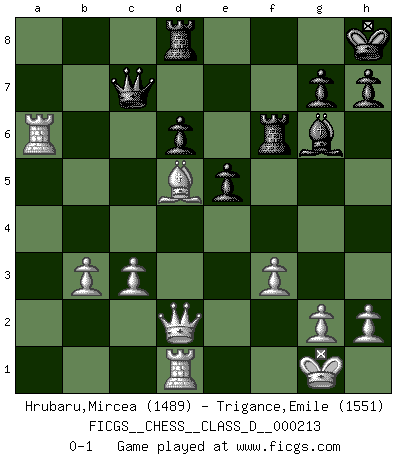 Last move : 0-1 2015 June 2 11:49:33 [Event "FICGS__CHESS__CLASS_D__000213"] [Site "FICGS"] [Date "2015.01.24"] [Round "1"] [White "Hrubaru,Mircea"] [Black "Trigance,Emile"] [Result "0-1"] [WhiteElo "1489"] [BlackElo "1551"] 1.e4 c5 2.Nf3 Nc6 3.d4 cxd4 4.Nxd4 Nf6 5.Nc3 e5 6.Ndb5 d6 7.Bg5 a6 8.Na3 b5 9.Nd5 Be7 10.Bxf6 Bxf6 11.c3 O-O 12.Nc2 Bg5 13.a4 bxa4 14.Rxa4 a5 15.Bc4 Rb8 16.b3 Kh8 17.Nce3 Bxe3 18.Nxe3 Ne7 19.O-O f5 20.exf5 Nxf5 21.Nxf5 Bxf5 22.Qd5 Qg5 23.Rxa5 Qg6 24.Re1 Rbe8 25.R5a1 Qf6 26.Qd2 Bg6 27.Ra6 Rd8 28.f3 Qe7 29.Rd1 Rf6 30.Bd5 Qc7 0-1 Sicilian : Pelikan (Lasker/Sveshnikov) variation Kingside Castling by player Black (move 11) Kingside Castling by player White (move 19) Player Black won this chess game. Follow this game move after move (download)Chess is the art of analysis. (Mikhail Botvinnik) Sitze auf Deine Hände. (Siegbert Tarrasch) Cada Peón es una Reina en potencia. (James Mason) Toutes les manuvres exécutées sur une colonne ouverte ont pour but ultime l'intrusion définitive sur la septième ou la huitième rangée, en plein cur de la position ennemie. (Aaron Nimzovitch) It is the aim of the modern school, not to treat every position according to one general law, but according to the principle inherent in the position. (Richard Reti)