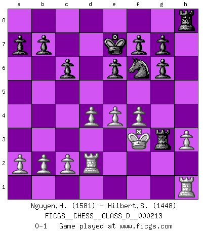 Last move : 0-1 2015 February 25 9:48:44 [Event "FICGS__CHESS__CLASS_D__000213"] [Site "FICGS"] [Date "2015.01.24"] [Round "1"] [White "Nguyen,Hao Nhien"] [Black "Hilbert,Stephan J."] [Result "0-1"] [WhiteElo "1581"] [BlackElo "1448"] 1.e4 d5 2.d4 dxe4 3.Nc3 Nf6 4.f3 e3 5.Bxe3 Bf5 6.Bd3 Bg6 7.Nge2 e6 8.Bxg6 hxg6 9.Qd2 c6 10.Bf4 Bd6 11.Ne4 Nxe4 12.fxe4 Bxf4 13.Qxf4 Qh4+ 14.g3 Qxf4 15.gxf4 Nd7 16.Kf2 Nf6 17.Ng3 Rh4 18.Kf3 Ke7 19.Rad1 Rah8 20.Rd2 Rg4 21.h3 Rxg3+ 0-1 Scandinavian (centre counter) defense Player Black won this chess game. Follow this game move after move (download)When your house is on fire, you can't be bothered with the neighbors. Or, as we say in Chess, if your King is under attack you don't worry about losing a Pawn on the Queen's side. (Gary Kasparov) Es ist wirklich schade, dass so viele Schachspieler nicht auf ihr Äußeres achten! (Alexandra Kosteniuk) ¿Quién es tu oponente esta tarde? Esta tarde mi oponente son las piezas negras. (Akiba Rubinstein) Je crois qu'il existe des manières très spécifiques de jouer efficacement contre une machine. Evidemment, nous n'avons aucune chance en technique pure, parce que l'ordinateur calcule de manière parfaite. Mais lorsque nous faisons appel à notre cerveau, en utilisant l'intuition et la compréhension, alors nous restons beaucoup plus forts. (Anatoli Karpov) CHESS, n. f. [echecs, Fr.] A nice and abstruse game, in which two sets of puppets are moved in opposition to each other. (Dr Samuel Johnson, A Dictionary Of The English Language, 1755)