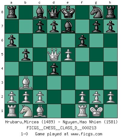 Last move : 1-0 2015 February 9 3:24:40 [Event "FICGS__CHESS__CLASS_D__000213"] [Site "FICGS"] [Date "2015.01.24"] [Round "1"] [White "Hrubaru,Mircea"] [Black "Nguyen,Hao Nhien"] [Result "1-0"] [WhiteElo "1489"] [BlackElo "1581"] 1.e4 e5 2.Nf3 Nc6 3.Bb5 a6 4.Ba4 b5 5.Bb3 Be7 6.O-O Nf6 7.d4 Nxd4 8.Nxd4 exd4 9.e5 Ng8 10.Qf3 f6 11.Qd5 1-0 Ruy Lopez : Caro variation Kingside Castling by player White (move 6) Player White won this chess game. Follow this game move after move (download)Blessed be the memory of him who gave the world this immortal game. (A. G. Gardiner) Offensichtlich kennt Kasparow nichts anderes als Schach, und ich könnte 500 weitere Spieler dieser Sorte benennen. (Judith Polgar) Fischer deseaba darle a los Rusos una sopa de su propia medicina. (Larry Evans) Fischer est le meilleur joueur du monde et Karpov n'est qu'un joueur de bistrot. (Garry Kasparov, agé de 16 ans) Nowadays, anyone who cannot speak English and is incapable of using the Internet is regarded as backward. (Al-Waleed bin Talal)