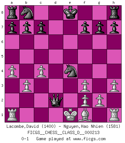Last move : 0-1 2015 February 1 12:37:31 [Event "FICGS__CHESS__CLASS_D__000213"] [Site "FICGS"] [Date "2015.01.24"] [Round "1"] [White "Lacombe,David"] [Black "Nguyen,Hao Nhien"] [Result "0-1"] [WhiteElo "1400"] [BlackElo "1581"] 1.Nc3 d5 2.Nxd5 Qxd5 3.d3 Nf6 4.Nf3 Bg4 5.b3 e5 6.c4 Bb4+ 7.Bd2 Qa5 8.a4 e4 9.dxe4 Nxe4 10.h3 Bxf3 11.exf3 Bxd2+ 12.Qxd2 Qxd2+ 0-1 Dunst (Sleipner, Heinrichsen) Opening Player Black won this chess game. Follow this game move after move (download)He who fears an isolated Queen's Pawn should give up Chess. (Siegbert Tarrasch) Das Zentrum ist der Balkan des Schachbretts - Kriegshandlungen können in jedem Moment ausbrechen. (Aaron Nimzowitsch) Aún el Rey más flojo huye despavorido ante la amenaza de un Jaque doble. (Aaron Nimzowitsch) Le moment que je préfère le plus dans une rencontre, c'est celui où je sens que la personnalité de l'adversaire se brise. (Robert Fischer) Just because you do not take an interest in politics doesn't mean politics won't take an interest in you. (Pericles 430 B.C.)