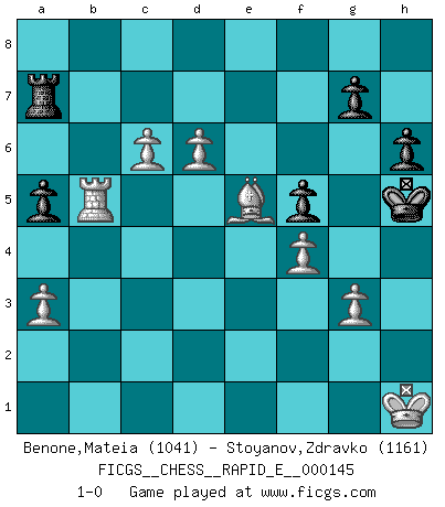 Last move : 1-0 2015 February 5 19:58:7 [Event "FICGS__CHESS__RAPID_E__000145"] [Site "FICGS"] [Date "2015.01.26"] [Round "1"] [White "Benone,Mateia"] [Black "Stoyanov,Zdravko"] [Result "1-0"] [WhiteElo "1041"] [BlackElo "1161"] 1.e4 c5 2.Nc3 Nc6 3.f4 e6 4.Nf3 a6 5.d4 cxd4 6.Nxd4 Bb4 7.a3 Bxc3+ 8.bxc3 h6 9.Bc4 b5 10.Bd3 Nge7 11.O-O Bb7 12.Kh1 Qa5 13.Bb2 O-O 14.Nb3 Qb6 15.Qg4 Ng6 16.h4 Qd8 17.h5 Qh4+ 18.Qxh4 Nxh4 19.g3 Ng6 20.hxg6 fxg6 21.Nc5 Bc8 22.c4 d6 23.Nb3 d5 24.cxd5 exd5 25.exd5 Ne7 26.d6 Nf5 27.Bxf5 gxf5 28.Nc5 Rd8 29.Be5 a5 30.Rab1 Bd7 31.Nxd7 Rxd7 32.Rxb5 Rc8 33.c3 Ra8 34.Rfb1 Kh7 35.Rb7 Ra7 36.Rxd7 Rxd7 37.Rb5 Ra7 38.c4 Kg6 39.c5 Kh5 40.c6 1-0 Sicilian : Grand Prix attack Kingside Castling by player White (move 11) Kingside Castling by player Black (move 13) Player White won this chess game. Follow this game move after move (download)Pawns: they are the soul of this game, they alone form the attack and defense. (Philidor) Woher wissen wir, daß der Neanderthaler Blindschach gespielt hat? -- Bei Ausgrabungen wurden keine Schachbretter und Figuren gefunden. (Anonymous) No es una movida, aún la mejor movida que tu debas buscar, sino un plan comprensible. (Eugene Znosko-Borovsky) Donnez-moi un Cavalier en 6e et je gagnerais toutes mes parties. (Steinitz) History is a gallery of pictures in which there are few originals and many copies. (Alexis de Tocqueville)