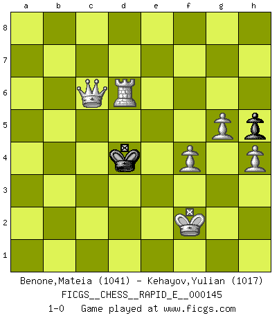 Last move : 1-0 2015 April 9 10:32:43 [Event "FICGS__CHESS__RAPID_E__000145"] [Site "FICGS"] [Date "2015.01.26"] [Round "1"] [White "Benone,Mateia"] [Black "Kehayov,Yulian"] [Result "1-0"] [WhiteElo "1041"] [BlackElo "1017"] 1.e4 e6 2.d4 d5 3.Nc3 c6 4.e5 g6 5.f4 Bg7 6.Nf3 h6 7.Bd3 Ne7 8.O-O O-O 9.Be3 Nf5 10.Bf2 b6 11.g4 Ne7 12.h4 c5 13.dxc5 bxc5 14.Bxc5 Re8 15.Bb5 Bd7 16.Qd3 Bxb5 17.Nxb5 Na6 18.Bxe7 Rxe7 19.Nd6 Nc5 20.Qe3 Nb7 21.Nxb7 Rxb7 22.b3 Rc8 23.Nd4 f6 24.Rac1 Qe7 25.a4 Qb4 26.Nxe6 fxe5 27.Nxg7 Kxg7 28.Qxe5+ Kh7 29.Qxd5 Qe7 30.g5 h5 31.Rfe1 Qd7 32.Qxd7+ Rxd7 33.c4 a5 34.c5 Rd3 35.Re7+ Kh8 36.c6 Rxb3 37.c7 Rd3 38.Rce1 Rc3 39.Re8+ Rxe8 40.Rxe8+ Kg7 41.c8Q Rxc8 42.Rxc8 Kf7 43.Kf2 Ke6 44.Rc5 Kd6 45.Rxa5 Kc6 46.Rb5 Kd6 47.a5 Kc6 48.Rb6+ Kc5 49.Rxg6 Kb5 50.a6 Kc4 51.a7 Kd5 52.a8Q+ Kc4 53.Qc6+ Kd4 54.Rd6+ 1-0 French : Paulsen variation Kingside Castling by player White (move 8) Kingside Castling by player Black (move 8) Promotion Queen by player White (move 41) 10 pieces endgame at move 42 : White KRPPPP , Black KPPP WHITE : King + 1 Rook 4 Pawns BLACK : King + 3 Pawns 9 pieces endgame at move 45 : White KRPPPP , Black KPP WHITE : King + 1 Rook 4 Pawns BLACK : King + 2 Pawns 8 pieces endgame at move 49 : White KRPPPP , Black KP WHITE : King + 1 Rook 4 Pawns BLACK : King + 1 Pawn Promotion Queen by player White (move 52) Player White won this chess game. Follow this game move after move (download)When you play Bobby, it is not a question if you win or lose. It is a question if you survive. (Boris Spassky) Es gibt zwei Arten von Opfern: Korrekte und meine. (Mikhail Nekhemyevich Tal) Hay dos clases de hombres: aquellos que se conforman en dejarse llevar por las circunstancias y que juegan barajas y aquellos decididos a controlar las circunstancias y que juegan al Ajedrez. (Mortimer Collins) Il (Jacob Murray) ne joue pas pour le bon coup, mais pour le meilleur. (Eloi Relange) All battles are fought by scared men who'd rather be someplace else. (John Wayne in the movie In harm's way)