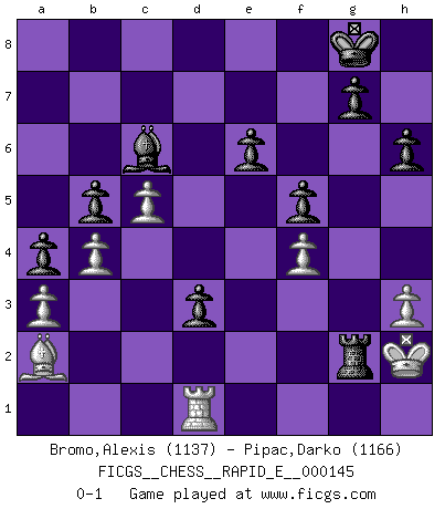 Last move : 0-1 2015 March 22 20:18:48 [Event "FICGS__CHESS__RAPID_E__000145"] [Site "FICGS"] [Date "2015.01.26"] [Round "1"] [White "Bromo,Alexis"] [Black "Pipac,Darko"] [Result "0-1"] [WhiteElo "1137"] [BlackElo "1166"] 1.d4 d5 2.c4 c6 3.Nc3 e6 4.a3 h6 5.e3 Nd7 6.Nf3 Ngf6 7.c5 Ne4 8.Nxe4 dxe4 9.Nd2 f5 10.Bc4 Nf6 11.h3 b5 12.Bb3 a5 13.O-O a4 14.Ba2 Be7 15.b4 O-O 16.f4 Qe8 17.Bb2 Qh5 18.Qxh5 Nxh5 19.Bb1 Ng3 20.Rf2 Bh4 21.Kh2 Bd7 22.Nf1 Nxf1+ 23.Rxf1 Rf6 24.d5 Rg6 25.dxc6 Bxc6 26.Ba2 Rd8 27.Rg1 Rd2 28.Be5 Rd3 29.Bd4 Bf2 30.Rgf1 Bxe3 31.Bxe3 Rxe3 32.Rfd1 Rd3 33.Rxd3 exd3 34.Rd1 Rxg2+ 0-1 QGD Slav defense Kingside Castling by player White (move 13) Kingside Castling by player Black (move 15) Player Black won this chess game. Follow this game move after move (download)Chess, like love, is infectious at any age. (Flohr) Kostenjuk hat keinen Sexappeal. (Loek van Wely) El Ajedrez es el gimnasio de la mente. (Blaise Pascal) On croit qu'il y a plus de mauvais joueurs que de bons joueurs, c'est faux : Il y a autant de joueurs qui gagnent que de joueurs qui perdent. (Philippe Geluck) All war is based on deception. (Sun Tzu)