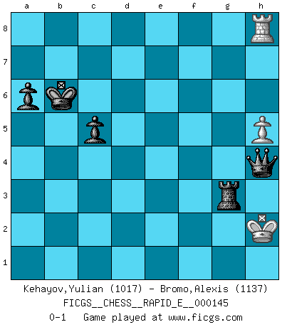Last move : 0-1 2015 May 8 22:1:7 [Event "FICGS__CHESS__RAPID_E__000145"] [Site "FICGS"] [Date "2015.01.26"] [Round "1"] [White "Kehayov,Yulian"] [Black "Bromo,Alexis"] [Result "0-1"] [WhiteElo "1017"] [BlackElo "1137"] 1.e4 e5 2.Nf3 Nc6 3.d4 d6 4.d5 Nb4 5.a3 Na6 6.c4 c6 7.Be2 c5 8.b3 h6 9.O-O Nf6 10.h3 Nxe4 11.Bd3 Nf6 12.Nc3 Be7 13.Ne4 Nxe4 14.Bxe4 Bd7 15.Nh4 Bxh4 16.Bf3 Nc7 17.Bg4 Bxg4 18.Qxg4 Qe7 19.Bb2 b5 20.Qxg7 O-O-O 21.Qg4+ Kb7 22.Rae1 Rdg8 23.Qe4 a6 24.g3 Bxg3 25.fxg3 Rxg3+ 26.Kh2 Rxb3 27.Re2 Rg8 28.Rf3 Rxf3 29.Qxf3 Ne8 30.Rf2 e4 31.Qe2 Nc7 32.Qh5 e3 33.Re2 bxc4 34.Bc3 Qe4 35.Qxh6 Nxd5 36.Qxd6 Qf4+ 37.Qxf4 Nxf4 38.Rxe3 Rg2+ 39.Kh1 Ra2 40.Rf3 Rxa3 41.Rxf4 Rxc3 42.Rxf7+ Kb6 43.Rh7 Rd3 44.h4 c3 45.h5 c2 46.Rh8 c1Q+ 47.Kh2 Qf4+ 48.Kg2 Rg3+ 49.Kh2 Qh4+ 0-1 Scotch Opening Kingside Castling by player White (move 9) Queenside Castling by player Black (move 20) 10 pieces endgame at move 41 : White KRBP , Black KRPPPP WHITE : King + 1 Rook 1 Bishop 1 Pawn BLACK : King + 1 Rook 4 Pawns 9 pieces endgame at move 41 : White KRP , Black KRPPPP WHITE : King + 1 Rook 1 Pawn BLACK : King + 1 Rook 4 Pawns 8 pieces endgame at move 42 : White KRP , Black KRPPP WHITE : King + 1 Rook 1 Pawn BLACK : King + 1 Rook 3 Pawns Promotion Queen by player Black (move 46) Player Black won this chess game. Follow this game move after move (download)In Chess, at least, the brave inherit the earth. (Edmar Mednis) Dein Körper muss in Topform sein. Dein Schach verfällt, wenn dein Körper verfällt. Der Körper kann nicht vom Geist getrennt werden. (Robert James Fischer) Botvinnik trató de alejar el misterio referente al Ajedrez, siempre relacionandolo a situaciones de la vida diaria. Solía llamar al Ajedrez un problema inexacto típico, similar a aquellos en que la gente tiene siempre que resolver a cada día. (Garry Kasparov) Je ne suis pas le dernier à jouer lâchement des coups douteux pendant le zeïtnot de l'adversaire pour l'achever: en effet les coups qui font le plus peur sont ceux que l'on ne comprend pas. Je me fais souvent peur quand je joue. (Un professeur anonyme) Chess is everything: art, science and sport. (Anatoly Karpov)