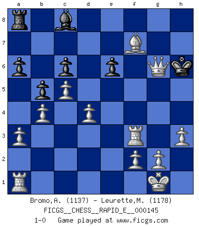 Last move : 1-0 2015 February 7 15:23:46 [Event "FICGS__CHESS__RAPID_E__000145"] [Site "FICGS"] [Date "2015.01.26"] [Round "1"] [White "Bromo,Alexis"] [Black "Leurette,Marc-Antoine"] [Result "1-0"] [WhiteElo "1137"] [BlackElo "1178"] 1.d4 d5 2.c4 e6 3.a3 Nf6 4.Nc3 Be7 5.e3 c6 6.Nf3 h6 7.h3 a6 8.b4 b5 9.c5 Nbd7 10.Bd3 g6 11.e4 dxe4 12.Nxe4 Nxe4 13.Bxe4 Qc7 14.O-O f5 15.Bc2 Nf6 16.Re1 O-O 17.Bxh6 Rf7 18.Ng5 Rh7 19.Nxh7 Kxh7 20.Bg5 Nh5 21.Bxe7 Qxe7 22.Bxf5 Qf6 23.Qxh5+ Kg7 24.Bxg6 Qf8 25.Re3 Qh8 26.Qe5+ Kg8 27.Bf7+ Kh7 28.Qh5+ Kg7 29.Rg3+ Kf8 30.Qxh8+ Ke7 31.Qe8+ Kf6 32.Rf3+ Kg7 33.Qg8+ Kh6 34.Qg6+ 1-0 Queen's gambit declined Kingside Castling by player White (move 14) Kingside Castling by player Black (move 16) Player White won this chess game. Follow this game move after move (download)Though most people love to look at the games of the great attacking masters, some of the most successful players in history have been the quiet positional players. They slowly grind you down by taking away your space, tying up your pieces, and leaving you with virtually nothing to do ! (Yasser Seirawan) Wenn du nicht weißt was du tun sollst, warte bis dein Gegner eine Idee hat. Sie wird sicher schlecht sein. (Siegbert Tarrasch) Los Peones son nacidos libres, y aún así, se encuentran por doquier encadenados. (Rick Kennedy) Les échecs sont un jeu terrible. Si vous n'avez pas le centre, votre adversaire a une position plus libre. Par contre, si vous avez le centre, alors vous avez vraiment quelque chose pour laquelle vous inquiéter ! (Siegbert Tarrasch) Wisdom doesn't necessarily come with age. Sometimes age just shows up all by itself. (Tom Wilson)