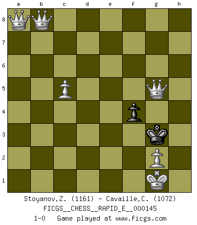 Last move : 1-0 2015 January 29 20:28:47 [Event "FICGS__CHESS__RAPID_E__000145"] [Site "FICGS"] [Date "2015.01.26"] [Round "1"] [White "Stoyanov,Zdravko"] [Black "Cavaille,Cedric"] [Result "1-0"] [WhiteElo "1161"] [BlackElo "1072"] 1.e4 c5 2.Nf3 e6 3.h3 d6 4.a3 Nc6 5.Bb5 Bd7 6.d3 a6 7.Ba4 Be7 8.O-O Nf6 9.Bxc6 Bxc6 10.Re1 O-O 11.Nc3 d5 12.exd5 Nxd5 13.Nxd5 exd5 14.Ne5 Qc7 15.Bf4 Bd6 16.Qg4 Rfe8 17.Nxc6 Rxe1+ 18.Rxe1 Bxf4 19.Re7 Qxc6 20.Qxf4 Rf8 21.Rc7 Qa4 22.Qxa4 b5 23.Qxa6 c4 24.Qxb5 cxd3 25.Qxd3 Rd8 26.Qf5 Rf8 27.Rc8 g6 28.Rxf8+ Kxf8 29.Qxd5 Kg7 30.a4 h5 31.a5 f5 32.a6 Kh6 33.a7 Kg5 34.a8Q Kh4 35.b4 f4 36.b5 g5 37.b6 g4 38.hxg4 hxg4 39.b7 g3 40.fxg3+ Kxg3 41.b8Q Kg4 42.c4 Kh4 43.c5 Kg3 44.Qg5+ 1-0 Sicilian defense Kingside Castling by player White (move 8) Kingside Castling by player Black (move 10) Promotion Queen by player White (move 34) 10 pieces endgame at move 38 : White KQQPPPP , Black KPP WHITE : King + 2 Queens 4 Pawns BLACK : King + 2 Pawns 9 pieces endgame at move 40 : White KQQPPPP , Black KP WHITE : King + 2 Queens 4 Pawns BLACK : King + 1 Pawn 8 pieces endgame at move 40 : White KQQPPP , Black KP WHITE : King + 2 Queens 3 Pawns BLACK : King + 1 Pawn Promotion Queen by player White (move 41) Player White won this chess game. Follow this game move after move (download)The beauty of a move lies not in its' appearance but in the thought behind it. (Siegbert Tarrasch) Um dein Spiel zu verbessern musst du zuallererst das Endspiel studieren, denn diese kann unabhängig studiert werden. Die Eröffnung und das Mittelspiel müssen immer in Bezug gesetzt werden zum Endspiel. (José Raúl Capablanca) El Ajedrez, como la música, como el amor, tiene el poder de hacer feliz a la gente. (Siegbert Tarrasch) Tout change constamment, y compris dans le monde des Echecs. (Botvinnik) If everyone is thinking alike, then somebody isn't thinking. (US General George S. Patton)