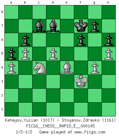 Last move : 1/2-1/2 2015 February 21 14:8:42 [Event "FICGS__CHESS__RAPID_E__000145"] [Site "FICGS"] [Date "2015.01.26"] [Round "1"] [White "Kehayov,Yulian"] [Black "Stoyanov,Zdravko"] [Result "1/2-1/2"] [WhiteElo "1017"] [BlackElo "1161"] 1.e4 c5 2.d4 cxd4 3.Qxd4 Nc6 4.Qd1 a6 5.Nf3 e5 6.Be2 h6 7.O-O Nf6 8.Nc3 Bb4 9.Bd2 O-O 10.a3 Be7 11.h3 d6 12.Nd5 Nxd5 13.exd5 Na7 14.c4 Bf6 15.Bd3 Re8 16.Be4 Bd7 17.b3 Nc8 18.Be3 Ne7 19.b4 Rc8 20.Rc1 Ra8 21.c5 dxc5 22.Rxc5 b6 23.Rc1 Bb5 24.Re1 Qd6 25.a4 Bd7 26.Qb3 a5 27.b5 Rac8 28.Rxc8 Rxc8 29.Rc1 Rxc1+ 30.Bxc1 Kh8 31.Ba3 Qc7 32.Qb2 Nc8 33.Qc2 Qxc2 34.Bxc2 Ne7 35.Bxe7 Bxe7 36.Nxe5 Be8 37.g4 Kg8 38.Kg2 Bd6 39.f4 f6 40.Nc4 Bxf4 41.Kf3 Bc7 42.h4 Bd7 43.h5 Kf7 44.Be4 Ke7 45.Bc2 Kf7 46.Be4 1/2-1/2 Sicilian : Smith-Morra gambit Kingside Castling by player White (move 7) Kingside Castling by player Black (move 9) This chess game ended in a draw. Follow this game move after move (download)I played Chess with him and would have beaten him sometimes only he always took back his last move, and ran the game out differently. (Mark Twain) Schach verlangt totale Konzentration. (Robert James Fischer) Siempre es mejor sacrificar los hombres de tu oponente. (Savielly Tartakower) Votre seul travail dans les ouvertures est d'obtenir un milieu de partie jouable. (Lajos Portish) The mind is like a parachute, it only functions when its open. (Unknown)