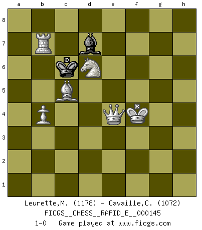 Last move : 1-0 2015 February 10 23:5:12 [Event "FICGS__CHESS__RAPID_E__000145"] [Site "FICGS"] [Date "2015.01.26"] [Round "1"] [White "Leurette,Marc-Antoine"] [Black "Cavaille,Cedric"] [Result "1-0"] [WhiteElo "1178"] [BlackElo "1072"] 1.e4 c5 2.Nc3 e6 3.g3 b6 4.Bg2 Bb7 5.d3 d6 6.Bd2 Nf6 7.Qe2 Be7 8.f4 Nc6 9.O-O-O d5 10.e5 Nd7 11.h4 d4 12.Ne4 f5 13.Nd6+ Bxd6 14.exd6 O-O 15.h5 h6 16.Nh3 Nf6 17.Qxe6+ Rf7 18.Rhe1 Ne8 19.Bd5 Nxd6 20.Qg6 Ne7 21.Bxf7+ Nxf7 22.Qe6 Qd5 23.b3 Qxe6 24.Rxe6 Re8 25.Rde1 Kf8 26.c3 Bd5 27.R6e2 Bf3 28.Rf2 Bxh5 29.cxd4 Bg4 30.Ng1 cxd4 31.Bb4 g6 32.Rc2 h5 33.Rc7 g5 34.Bxe7+ Kg7 35.Rxa7 h4 36.gxh4 gxh4 37.Bxh4 Rxe1+ 38.Bxe1 Kg6 39.Rb7 b5 40.Rxb5 Kf6 41.a4 Nd6 42.Rb6 Ke7 43.Bb4 Kd7 44.Bxd6 Bh5 45.a5 Bf7 46.b4 Bb3 47.Be5 Ke7 48.Bxd4 Kd7 49.a6 Bd5 50.a7 Kc7 51.a8Q Bxa8 52.Ne2 Bf3 53.Ng3 Bd5 54.Nxf5 Bf3 55.Nd6 Be2 56.f5 Bxd3 57.f6 Bg6 58.Bc5 Bh5 59.Kd2 Bg6 60.Ke3 Bh5 61.Kf4 Be2 62.f7 Bc4 63.f8Q Be6 64.Qe7+ Bd7 65.Rb7+ Kc6 66.Qe4+ 1-0 Sicilian : Closed Queenside Castling by player White (move 9) Kingside Castling by player Black (move 14) Promotion Queen by player White (move 51) 10 pieces endgame at move 51 : White KRBNPPP , Black KBP WHITE : King + 1 Rook 1 Bishop 1 Knight 3 Pawns BLACK : King + 1 Bishop 1 Pawn 9 pieces endgame at move 54 : White KRBNPPP , Black KB WHITE : King + 1 Rook 1 Bishop 1 Knight 3 Pawns BLACK : King + 1 Bishop 8 pieces endgame at move 56 : White KRBNPP , Black KB WHITE : King + 1 Rook 1 Bishop 1 Knight 2 Pawns BLACK : King + 1 Bishop Promotion Queen by player White (move 63) Player White won this chess game. Follow this game move after move (download)Methodical thinking is of more use in Chess than inspiration. (C. J. S. Purdy) Schach sollte überall auf der Welt Schulfach werden. Es fördert die geistige Auseinandersetzung. Es lehrt die Demut in der Niederlage. (Garry Kasparov) El jugador táctico debe saber que hacer cuando algo se debe de hacer. El estratégico debe saber que hacer cuando nada se debe de hacer. (Savielly Tartakover) Les Echecs sont et restent toujours un combat, un combat intégral comme la boxe, la lutte ou un autre sport, et où il doit y avoir un vainqueur et un vaincu. (Joseph Emil Diemer) Inventor: A person who makes an ingenious arrangement of wheels, levers and springs, and believes it civilization. (Ambrose Bierce, The Devil's Dictionary)