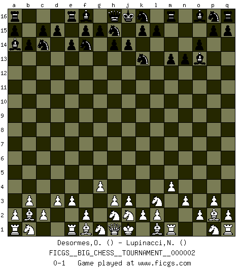 Last move : 0-1 2007 April 13 10:53:59 [Event "FICGS__BIG_CHESS__TOURNAMENT__000002"] [Site "FICGS"] [Date "2007.02.28"] [Round "1"] [White "Desormes,Olivier"] [Black "Lupinacci,Nicola"] [Result "0-1"] [WhiteElo ""] [BlackElo ""] 1.g2-g4 b16-c14 2.b2-b3 g16-f14 3.c1-b2 o15-o14 4.e2-e3 n15-n13 5.p2-p3 m15-m13 6.o1-p2 b15-b14 7.m2-m4 l16-o13 8.d2-d3 c16-a14 9.n2-n3 j15-k13 10.k1-l3 e15-e14 0-1 This big chess game has been lost on time (started : 2007.02.28 17:14:10) Follow this game move after move (download)A Chess game is a dialogue, a conversation between a player and his opponent. Each move by the opponent may contain threats or be a blunder, but a player cannot defend against threats or take advantage of blunders if he does not first ask himself: What is my opponent planning after each move ? (Bruce A. Moon) Ich moechte nie einem Club beitreten, der Leute wie mich als Mitglieder aufnimmt. (Woody Allen) Cada Peón es potencialmente una Reina. (James Mason) Aux échecs, l'amour-propre est satisfait quand on remporte la victoire, mais il n'y a pas de honte à être battu. (Benjamin Franklin) The man who strikes first admits that his ideas have given out. (Chinese proverb)