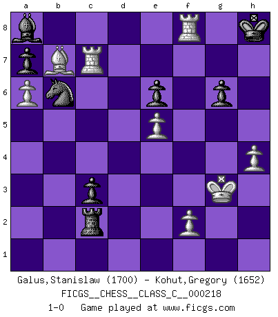 Last move : 1-0 2015 April 23 5:24:18 [Event "FICGS__CHESS__CLASS_C__000218"] [Site "FICGS"] [Date "2015.01.30"] [Round "1"] [White "Galus,Stanislaw"] [Black "Kohut,Gregory"] [Result "1-0"] [WhiteElo "1700"] [BlackElo "1652"] 1.e4 e6 2.d4 d5 3.Nc3 Bb4 4.e5 c5 5.a3 Bxc3+ 6.bxc3 Ne7 7.Nf3 Nbc6 8.Be2 Qa5 9.O-O b6 10.dxc5 bxc5 11.c4 dxc4 12.Qe1 Qxe1 13.Rxe1 Ba6 14.Be3 O-O 15.Bxc5 Rfd8 16.Bd6 h6 17.Red1 Nd5 18.Nd4 Nxd4 19.Rxd4 Rac8 20.a4 g6 21.h4 Kg7 22.Kh2 h5 23.g4 hxg4 24.Rxg4 Rh8 25.Kg3 Rh7 26.a5 R7h8 27.Bf3 Bb7 28.a6 Ba8 29.Ra5 Nb6 30.Bb7 Rcd8 31.Be7 Rd2 32.Bf6+ Kh7 33.Bxh8 Kxh8 34.Rc5 Kg7 35.Rc7 Rxc2 36.Rf4 c3 37.R4xf7+ Kh8 38.Rf8+ 1-0 French : Winawer, Advance, positional Main line Kingside Castling by player White (move 9) Kingside Castling by player Black (move 14) Player White won this chess game. Follow this game move after move (download)Let the perfectionist play postal. (Yasser Seirawan) Mutter, ich bin eben Ex-Weltmeister geworden. --beim nach Hause Kommen nach dem Verlust des WM-Titels an Mihail Botvinnik -- (Mikhail Nekhemyevich Tal) El Ajedrez es parte de la cultura, y si una cultura esta en decadencia, entonces también el Ajedrez declinará. (Mikhail Botvinnik) On est toujours la mazette de quelqu'un d'autre. (Anonyme) Luck never made a man wise. (Seneca, Letters to Lucilius)
