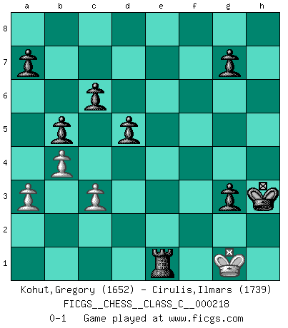 Last move : 0-1 2015 November 12 18:32:49 [Event "FICGS__CHESS__CLASS_C__000218"] [Site "FICGS"] [Date "2015.01.30"] [Round "1"] [White "Kohut,Gregory"] [Black "Cirulis,Ilmars"] [Result "0-1"] [WhiteElo "1652"] [BlackElo "1739"] 1.e4 e5 2.Nf3 Nf6 3.d4 exd4 4.e5 Ne4 5.Qxd4 f5 6.exf6 Nxf6 7.Bd3 Nc6 8.Qh4 Nb4 9.Bg6+ hxg6 10.Qxh8 Qe7+ 11.Kd1 Ne4 12.Be3 Nd5 13.Re1 Nxe3+ 14.Rxe3 d5 15.Qh4 Qxh4 16.Nxh4 Bc5 17.Re2 Bxf2 18.Nf3 Bf5 19.Nbd2 O-O-O 20.Kc1 Bc5 21.a3 Bd6 22.Kd1 Bc5 23.Ke1 Bd6 24.Rd1 Rh8 25.g3 Bg4 26.Kf1 Nxd2+ 27.Nxd2 Bxe2+ 28.Kxe2 Rxh2+ 29.Kf3 Be7 30.Kg4 b5 31.b4 c6 32.c3 Bf6 33.Nb1 Rf2 34.Rc1 Kc7 35.Kh3 Kd7 36.Kg4 Kd6 37.Kh3 Be5 38.Kg4 Rg2 39.Kf3 Rxg3+ 40.Kf2 g5 41.Kf1 Rh3 42.Kg2 Rh2+ 43.Kg1 Rb2 44.Kh1 Ke6 45.Re1 Kf5 46.Rf1+ Kg4 47.Rg1+ Kh3 48.Re1 g4 49.Kg1 g3 50.Rd1 Bf4 51.Re1 Be3+ 52.Rxe3 Rxb1+ 53.Re1 Rxe1+ 0-1 This chess game has been lost on time (started : 2015.01.30 17:55:45) Comment by player 2 : Ilmars Cirulis : Petrov : Modern attack, Main line Queenside Castling by player Black (move 19) Player Black won this chess game. Follow this game move after move (download)Many Chess players were surprised when after the game, Fischer quietly explained: 'I had already analyzed this possibility' in a position which I thought was not possible to foresee from the opening. (Mikhail Tal) Intelligenz läßt sich nicht am Weg, sondern nur am Ergebnis feststellen. (Garry Kasparov) Una victoria por una combinación errónea, aunque sea espectacular, me llena de horror artístico. (Wilhelm Steinitz) Les pièces de l'échiquier étaient impitoyables. Elles le retenaient, elles l'absorbaient. Il y avait de l'horreur en cela, mais aussi une harmonie unique. Car, qu'y a-t-il dans le monde, à part les échecs ? (V. Nabokov) Perhaps the current trend of many chess professionals taking up the more lucrative pastime of poker is not a wholly negative one. It may not be too late for humans to relearn how to take risks in order to innovate and thereby maintain the advanced lifestyles we enjoy. And if it takes a poker-playing supercomputer to remind us that we can't enjoy the rewards without taking the risks, so be it. (The Chess Master and the Computer, by Garry Kasparov - 2010)