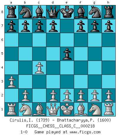 Last move : 1-0 2015 March 13 13:19:12 [Event "FICGS__CHESS__CLASS_C__000218"] [Site "FICGS"] [Date "2015.01.30"] [Round "1"] [White "Cirulis,Ilmars"] [Black "Bhattacharyya,Pinaki"] [Result "1-0"] [WhiteElo "1739"] [BlackElo "1600"] 1.c4 e5 2.a3 1-0 This chess game has been lost on time (started : 2015.01.30 17:55:45) English Opening Player White won this chess game. Follow this game move after move (download)Kasparov : J'adoube , Ivanchuk : S'il vous plaît ! (Garry Kasparov & Vassily Ivanchuk, Linares 1997) Ich würde die 30 stärksten Spieler der USA im Simultanspiel besiegen. (José Raúl Capablanca) Nos gusta pensar. (Gary Kasparov) D'abord les bases : Jouez et étudiez, puis étudiez et jouez, ensuite jouez et étudiez, puis étudiez et jouez. Deuxièmement : Donnez toujours le meilleur de vous-même ! (Ken Smith) After growing wildly for years, the field of computing appears to be reaching its infancy. (John Pierce)