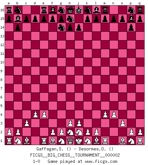 Last move : 1-0 2007 April 21 5:59:30 [Event "FICGS__BIG_CHESS__TOURNAMENT__000002"] [Site "FICGS"] [Date "2007.02.28"] [Round "1"] [White "Gaffagan,Steven"] [Black "Desormes,Olivier"] [Result "1-0"] [WhiteElo ""] [BlackElo ""] 1.m2-m4 p15-p14 2.n2-n4 b15-b14 3.e2-e4 j15-g14 4.d2-d4 o16-p15 5.c2-c3 c16-b15 6.o2-o3 1-0 This big chess game has been lost on time (started : 2007.02.28 17:14:10) Follow this game move after move (download)The isolated Pawn casts gloom over the entire chessboard. (Aaron Nimzovich) Ich hatte Angst gegen einen russischen Großmeister zu verlieren, und er befürchtete gegen einen kleinen Jungen zu verlieren. (über ein Remis gegen Juri Awerbach). (Robert James Fischer) Hasta este punto, las blancas han seguido un análisis bien conocido. Pero ahora el hace un error fatal: empieza a usar su propia cabeza. (Siegbert Tarrasch) Horreur, mais aussi harmonie suprême : qu'y avait-il en effet au monde en dehors des échecs ? Le brouillard, l'inconnu, le non-être... (Vladimir Nabokov) Perception is reality. (Immanuel Kant)