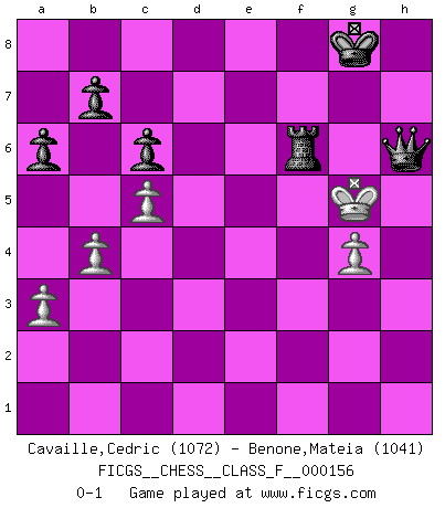 Last move : 0-1 2015 February 20 12:49:22 [Event "FICGS__CHESS__CLASS_F__000156"] [Site "FICGS"] [Date "2015.01.31"] [Round "1"] [White "Cavaille,Cedric"] [Black "Benone,Mateia"] [Result "0-1"] [WhiteElo "1072"] [BlackElo "1041"] 1.d4 d5 2.c4 dxc4 3.Qa4+ c6 4.Qxc4 Nf6 5.e3 Bf5 6.Nf3 e6 7.g3 Nbd7 8.Bg2 Nb6 9.Qe2 Bb4+ 10.Bd2 Qe7 11.a3 Bxd2+ 12.Nbxd2 O-O 13.O-O Rfd8 14.Nc4 Nxc4 15.Qxc4 Rac8 16.Qc5 Qxc5 17.dxc5 Rd5 18.b4 Rcd8 19.Nd4 R5d7 20.Bf3 Be4 21.Be2 e5 22.Nf3 Bxf3 23.Bxf3 e4 24.Be2 Rd2 25.Rfe1 Rb2 26.Kg2 g6 27.Red1 Rxd1 28.Bxd1 Nd5 29.Bg4 Nxe3+ 30.Kh3 Nxg4 31.Kxg4 Rxf2 32.Re1 a6 33.Rxe4 f5+ 34.Kg5 fxe4 35.h4 e3 36.h5 e2 37.hxg6 hxg6 38.Kxg6 e1Q 39.g4 Qb1+ 40.Kh6 Rf6+ 41.Kh5 Qh1+ 42.Kg5 Qh6+ 0-1 Queen's gambit accepted Kingside Castling by player Black (move 12) Kingside Castling by player White (move 13) Promotion Queen by player Black (move 38) Player Black won this chess game. Follow this game move after move (download)We don't really know how the game was invented, though there are suspicions. As soon as we discover the culprits, we'll let you know. (Bruce Pandolfini) Ich verstehe mehr vom Schach als irgendein anderer lebender Meister. (José Raúl Capablanca) El Ajedrez, como la música, como el amor, tiene el poder de hacer feliz a la gente. (Siegbert Tarrasch) Si rien de grave n'est détecté lors de l'analyse d'une position, on joue alors le coup. Seconde règle de Blumenfeld. You must have a dream in order to have it come true. (A.P.J. Kalam)