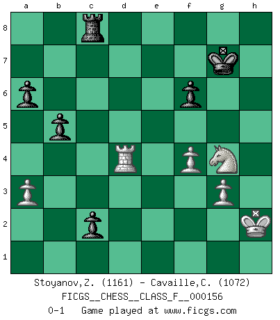 Last move : 0-1 2015 February 6 21:18:47 [Event "FICGS__CHESS__CLASS_F__000156"] [Site "FICGS"] [Date "2015.01.31"] [Round "1"] [White "Stoyanov,Zdravko"] [Black "Cavaille,Cedric"] [Result "0-1"] [WhiteElo "1161"] [BlackElo "1072"] 1.e4 c5 2.Nf3 e6 3.h3 d6 4.a3 Nc6 5.Bb5 Bd7 6.Bxc6 Bxc6 7.d3 Nf6 8.Bg5 h6 9.Bh4 Be7 10.O-O O-O 11.Nbd2 d5 12.exd5 exd5 13.Ne5 Qc7 14.Nxc6 Qxc6 15.Re1 Rfe8 16.Nf3 Bd8 17.Bxf6 Bxf6 18.c3 Rxe1+ 19.Qxe1 Qe8 20.Kh2 Qxe1 21.Rxe1 g5 22.d4 c4 23.g3 b5 24.h4 Kf8 25.hxg5 Bxg5 26.Re5 Bc1 27.Rxd5 a6 28.Rh5 Kg7 29.Ne5 Bxb2 30.Ng4 Bxc3 31.Rxh6 Bxd4 32.f4 f6 33.Rh5 Rc8 34.Rd5 c3 35.Rxd4 c2 0-1 Sicilian defense Kingside Castling by player White (move 10) Kingside Castling by player Black (move 10) Player Black won this chess game. Follow this game move after move (download)The chessboard is the world, the pieces are the phenomena of the Universe, the rules of the game are what we call the laws of Nature and the player on the other side is hidden from us. (Thomas Huxley) Modernes Schach sorgt sich zuviel um Dinge wie Bauernstruktur usw. Vergessen Sie das, Schachmatt beendet das Spiel! (Nigel Short) El Ajedrez es tan inspirador que yo no creo que un buen jugador sea capaz de tener un pensamiento malo durante una partida. (Wilhelm Steinitz) On a dit que l'homme se distingue de l'animal par le fait qu'il achète plus de livres qu'il ne peut en lire. Je voudrais suggérer qu'inclure à la liste des livres quelques livres d'échecs rendrait la distinction manifeste. (Edward Lasker) Coffee just isn't my cup of tea. (Unknown)