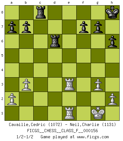 Last move : 1/2-1/2 2015 February 19 10:57:43 [Event "FICGS__CHESS__CLASS_F__000156"] [Site "FICGS"] [Date "2015.01.31"] [Round "1"] [White "Cavaille,Cedric"] [Black "Neil,Charlie"] [Result "1/2-1/2"] [WhiteElo "1072"] [BlackElo "1131"] 1.d4 Nf6 2.c4 e6 3.g3 d5 4.b3 c5 5.Bg2 Nc6 6.Nf3 Ne4 7.O-O cxd4 8.Nxd4 Nf6 9.Bg5 Be7 10.Qc2 O-O 11.cxd5 Nxd4 12.Qd3 Nf5 13.e4 Nd6 14.Nc3 Bd7 15.Rfe1 Nfxe4 16.Bxe7 Nxf2 17.Bxd8 Nxd3 18.Red1 Rfxd8 19.Rxd3 exd5 20.Bxd5 Bf5 21.Rf3 Bg6 22.Rd1 Kh8 23.Re3 Rab8 24.Rde1 Rbc8 25.Be4 Bxe4 26.Nxe4 h6 27.Nxd6 Rxd6 1/2-1/2 Catalan Opening Kingside Castling by player White (move 7) Kingside Castling by player Black (move 10) This chess game ended in a draw. Follow this game move after move (download)After a bad opening, there is hope for the middle game. After a bad middle game, there is hope for the endgame. But once you are in the endgame, the moment of truth has arrived. (Edmar Mednis) Die westlichen Werte sind eine Sprache, welche die Putin-Administration nicht versteht. (Garry Kasparov) Es el objetivo de la escuela moderna no tratar cada posición de acuerdo a una regla general, sino de acuerdo al principio inherente en la posición. (Richard Reti) Plusieurs personnes se sont demandées comment Tal faisait pour gagner... En fait, c'est très simple ! Il met ses pièces au centre de l'échiquier et les sacrifie quelque part ! (David Bronstein) All politicians must be presumed guilty until they are proven innocent. (Dinesh De Silva)