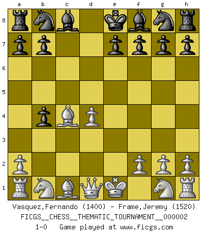 Last move : 1-0 2006 June 6 5:36:9 [Event "FICGS__CHESS__THEMATIC_TOURNAMENT__000002"] [Site "FICGS"] [Date "2006.05.30"] [Round "1"] [White "Vasquez,Fernando"] [Black "Frame,Jeremy"] [Result "1-0"] [WhiteElo "1400"] [BlackElo "1520"] 1.e4 c5 2.b4 cxb4 3.d4 d5 4.exd5 Qxd5 5.c4 Qxc4 6.Bxc4 1-0 Sicilian : wing gambit Player White won this chess game. Follow this game move after move (download)Man is a frivolous, a specious creature, and like a Chess player, cares more for the process of attaining his goal than for the goal itself. (Dostoyevsky) Wenn Dein Gegner dir ein Remis anbietet, versuch herauszufinden, weshalb er glaubt schlechter zu stehen. (Nigel Short) Los errores estan ahí, esperando a que se cometan. (Savielly Tartakower) Le jeu d'échecs est comme rejeté hors du temps. (Antoine de Saint-Exupéry) If you lose the game you should win the analysis! (Proverb)