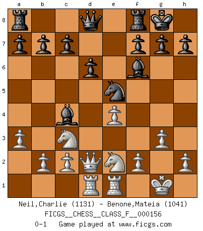 Last move : 0-1 2015 March 12 11:49:34 [Event "FICGS__CHESS__CLASS_F__000156"] [Site "FICGS"] [Date "2015.01.31"] [Round "1"] [White "Neil,Charlie"] [Black "Benone,Mateia"] [Result "0-1"] [WhiteElo "1131"] [BlackElo "1041"] 1.e4 d6 2.d4 Nf6 3.Nc3 e5 4.Bc4 exd4 5.Qxd4 Nc6 6.Qd3 Be7 7.Be3 O-O 8.Nge2 Nb4 9.Qd2 Be6 10.a3 Bxc4 11.O-O Nc6 12.Rfe1 Ng4 13.Bf4 Bh4 14.g3 Bf6 15.Rad1 Nge5 16.Bxe5 Nxe5 0-1 Pirc defense Kingside Castling by player Black (move 7) Kingside Castling by player White (move 11) Player Black won this chess game. Follow this game move after move (download)The essence of Chess is thinking about what Chess is. (David Bronstein) Im Fernschach kannst du während dem Spiel rauchen. (John Christen Knudsen) La partida mas dura de ganar es una partida ganada. (Emanuel Lasker) Les réformistes prétendent que les progrès de la théorie conduiront à la disparition des échecs, et qu'il faut, pour leur rendre vie, en remanier les règles. En réalité, qu'exprime cette affirmation? Le mépris de l'intuition, de l'imagination et de tous les autres éléments qui font des échecs un art. (Alexander Alekhine) The only thing that overcomes hard luck is hard work. (Harry Golden)