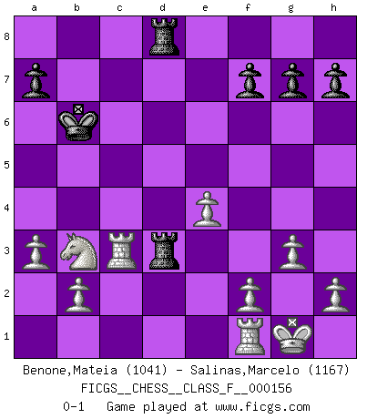 Last move : 0-1 2015 September 4 22:19:29 [Event "FICGS__CHESS__CLASS_F__000156"] [Site "FICGS"] [Date "2015.01.31"] [Round "1"] [White "Benone,Mateia"] [Black "Salinas,Marcelo"] [Result "0-1"] [WhiteElo "1041"] [BlackElo "1167"] 1.e4 e5 2.Nf3 Nc6 3.d4 Bb4+ 4.c3 Ba5 5.d5 Nd4 6.Nfd2 Qh4 7.cxd4 Bxd2+ 8.Nxd2 exd4 9.g3 Qf6 10.Nb3 Qe5 11.Qxd4 d6 12.Qxe5+ dxe5 13.Bb5+ c6 14.dxc6 Kd8 15.Be3 Ne7 16.cxb7 Bxb7 17.Nc5 Bc6 18.Bxc6 Nxc6 19.Rd1+ Kc8 20.O-O Rd8 21.a3 Nd4 22.Bxd4 exd4 23.Rc1 d3 24.Nxd3 Kb7 25.Nc5+ Kb6 26.Nb3 Rd3 27.Rc3 Rad8 0-1 Scotch Opening Kingside Castling by player White (move 20) Player Black won this chess game. Follow this game move after move (download)Adequate compensation for a sacrifice is having a sound combination leading to a winning position; adequate compensation for a blunder is having your opponent snatch defeat from the jaws of victory. (Bruce A. Moon) Im Spitzenschach von heute geht es nur um Vorbereitung, um tiefgründige, sorgfältige Eröffnungsvorbereitung. (Nigel Short) En la vida, como en el Ajedrez, los Peones propios obstruyen nuestro camino. La gran fortuna de un hombre, su comodidad, placer, hijos, libros, que deberían ayudarle a ganar, con mucha frecuencia lo ponen en Jaque Mate. (Charles Buxton) Les pièces de l'échiquier étaient impitoyables. Elles le retenaient, elles l'absorbaient. Il y avait de l'horreur en cela, mais aussi une harmonie unique. Car, qu'y a-t-il dans le monde, à part les échecs ? (V. Nabokov) A person who never made a mistake never tried anything new. (Albert Einstein)