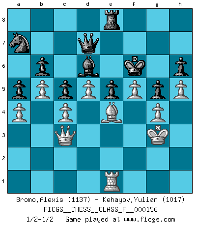 Last move : 1/2-1/2 2015 May 8 22:7:8 [Event "FICGS__CHESS__CLASS_F__000156"] [Site "FICGS"] [Date "2015.01.31"] [Round "1"] [White "Bromo,Alexis"] [Black "Kehayov,Yulian"] [Result "1/2-1/2"] [WhiteElo "1137"] [BlackElo "1017"] 1.d4 e6 2.c4 d6 3.Nc3 Nf6 4.Nf3 Be7 5.h3 O-O 6.e4 Nc6 7.Be3 a6 8.a3 Re8 9.Be2 Na7 10.O-O c5 11.d5 e5 12.b4 b6 13.b5 a5 14.a4 h6 15.Nh4 g5 16.Nf5 Bxf5 17.exf5 Qd7 18.Bd3 Nh7 19.h4 f6 20.g4 Bd8 21.h5 Bc7 22.Ne4 Rac8 23.Kg2 Kf7 24.Kg3 Kg7 25.Qd2 Kf7 26.f4 exf4+ 27.Bxf4 gxf4+ 28.Qxf4 Ng5 29.Nxg5+ fxg5 30.Qd2 Kf6 31.Qc3+ Re5 32.Rae1 Rce8 33.Rxe5 dxe5 34.Be4 Bd6 35.Re1 1/2-1/2 Queen's pawn Kingside Castling by player Black (move 5) Kingside Castling by player White (move 10) This chess game ended in a draw. Follow this game move after move (download)A thorough understanding of the typical mating continuations makes the most complicated sacrificial combinations leading up to them not only not difficult, but almost a matter of course. (Siegbert Tarrasch) Fallen sollten polizeilich verboten werden. (Savielly Grigorievitsch Tartakower) Las Aperturas te enseñan aperturas. ¡Los Finales te enseñan Ajedrez!. (Stephan Gerzadowicz) Votre seul travail dans les ouvertures est d'obtenir un milieu de partie jouable. (Lajos Portish) Some people are so afraid to die that they never begin to live. (Henry Van Dyke)