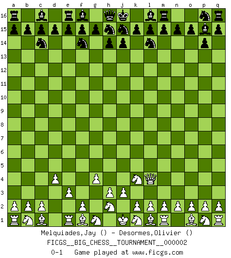 Last move : 0-1 2007 April 26 6:49:58 [Event "FICGS__BIG_CHESS__TOURNAMENT__000002"] [Site "FICGS"] [Date "2007.02.28"] [Round "1"] [White "Melquiades,Jay"] [Black "Desormes,Olivier"] [Result "0-1"] [WhiteElo ""] [BlackElo ""] 1.g2-g4 g16-f14 2.j2-k4 p15-p14 3.h1-l4 k16-l14 4.d2-d4 o16-p15 5.e2-e3 b16-c14 0-1 This big chess game has been lost on time (started : 2007.02.28 17:14:10) Follow this game move after move (download)The combination player thinks forward; he starts from the given position, and tries the forceful moves in his mind. (Emanuel Lasker) Verschiedene, sehr schätzbare und im Laufe des Lebens nützliche Eigenschaften des Geistes können durch das Schachspiel erworben und gekräftigt werden, so dass sie zu Gewohnheiten werden, die uns nie im Stich lassen. (Benjamin Franklin) Algunos sacrificios son sólidos, los demás son míos. (Mikhail Tal) J'apprécie les joueurs d'est-indienne, c'est grâce à eux que je nourris ma famille depuis tant d'années. (Petrosian) No enterprise is more likely to succeed than one concealed from the enemy until it is ripe for execution. (Niccolo Machiavelli)